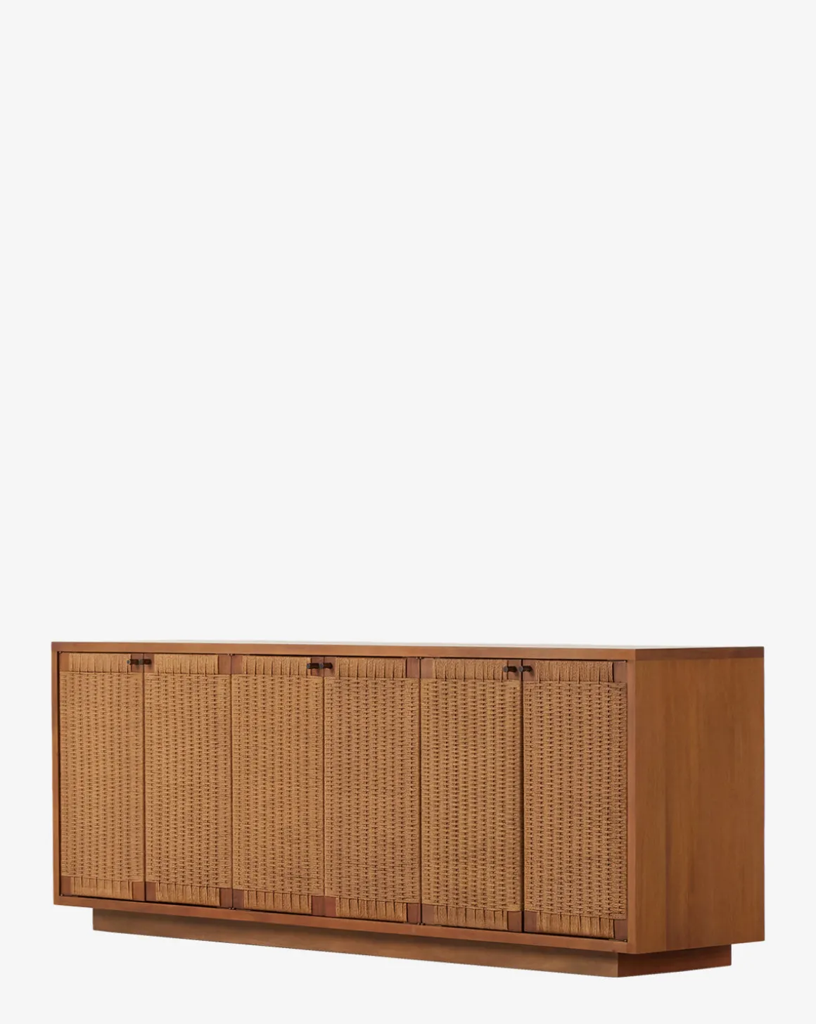 With midcentury inspired design, the Ackerman Sideboard features doors with woven paper cord for an organic and textural look. The mahogany veneer frame rests on a plinth-style base, bringing a sophisticated and shapely feel to your living space.