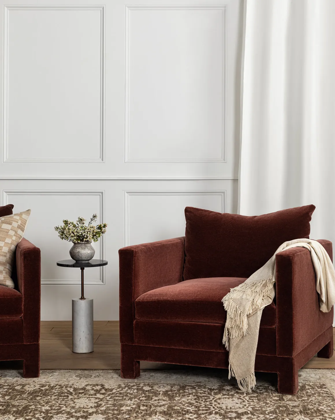Made to order with a timeless silhouette and upholstered legs, the modern frame of the Appoline Chair holds a wide cushion that is firm, yet comfortable. As part of the made to order Upholstery Collection, the chair is available in a selection of high-quality fabrics that highlight its simple and elegant frame.