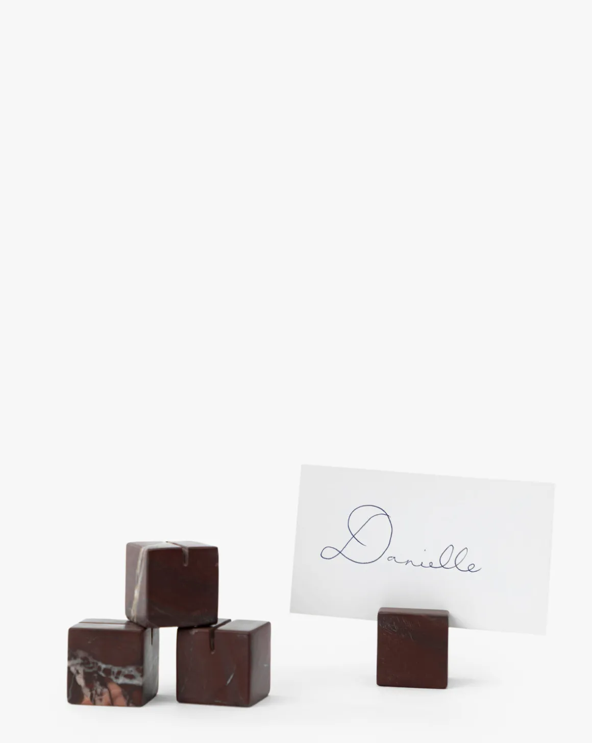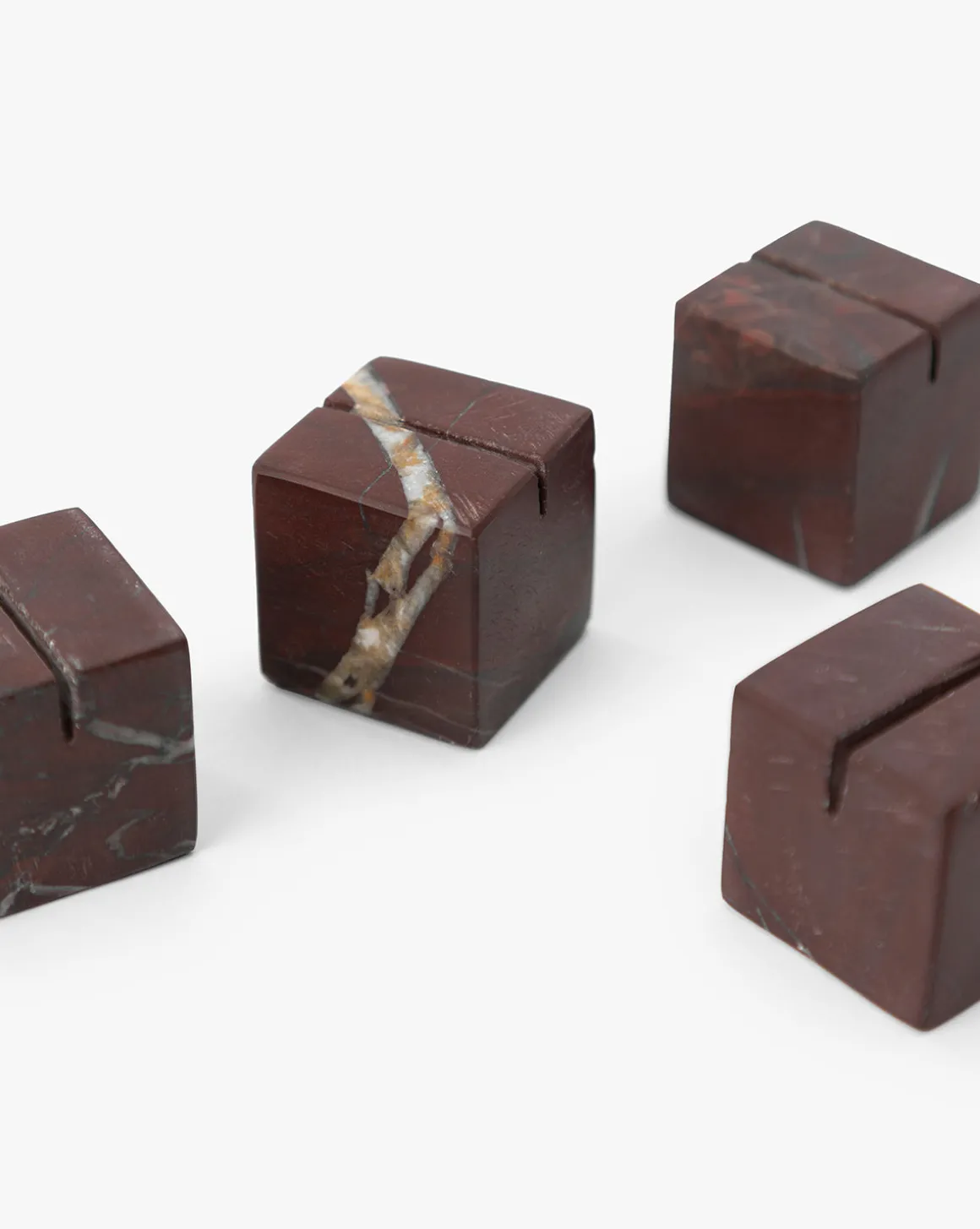 Crafted from richly veined auburn marble, this set of four place card holders brings organic elegance to your seasonal table. Each piece features unique color variations in warm, earthy tones—perfect for grounding a sophisticated harvest tablescape or adding a thoughtful touch to holiday gatherings. A refined detail made to elevate every seat at the table.
