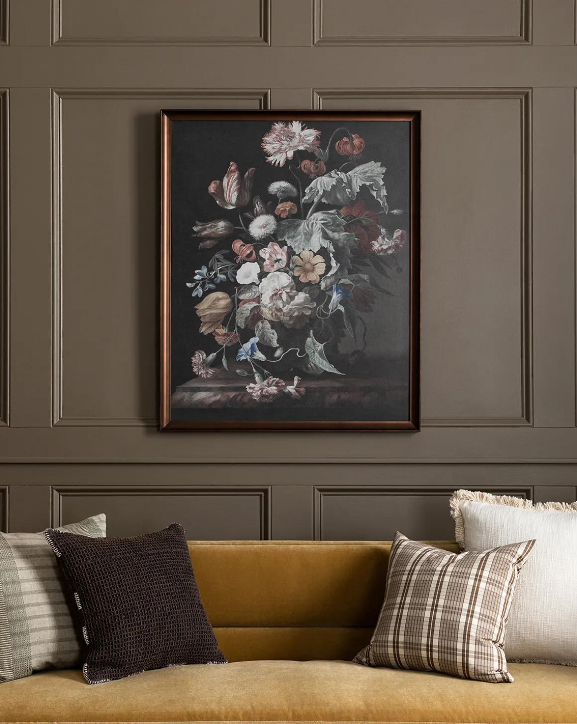 Elegant and moody, Botanical Renaissance brings beauty to your space in the form of a lush vase of flowers contrasted against a dark background. Presented within a bronze-finished frame, this piece brings gallery-quality materials to your decor.