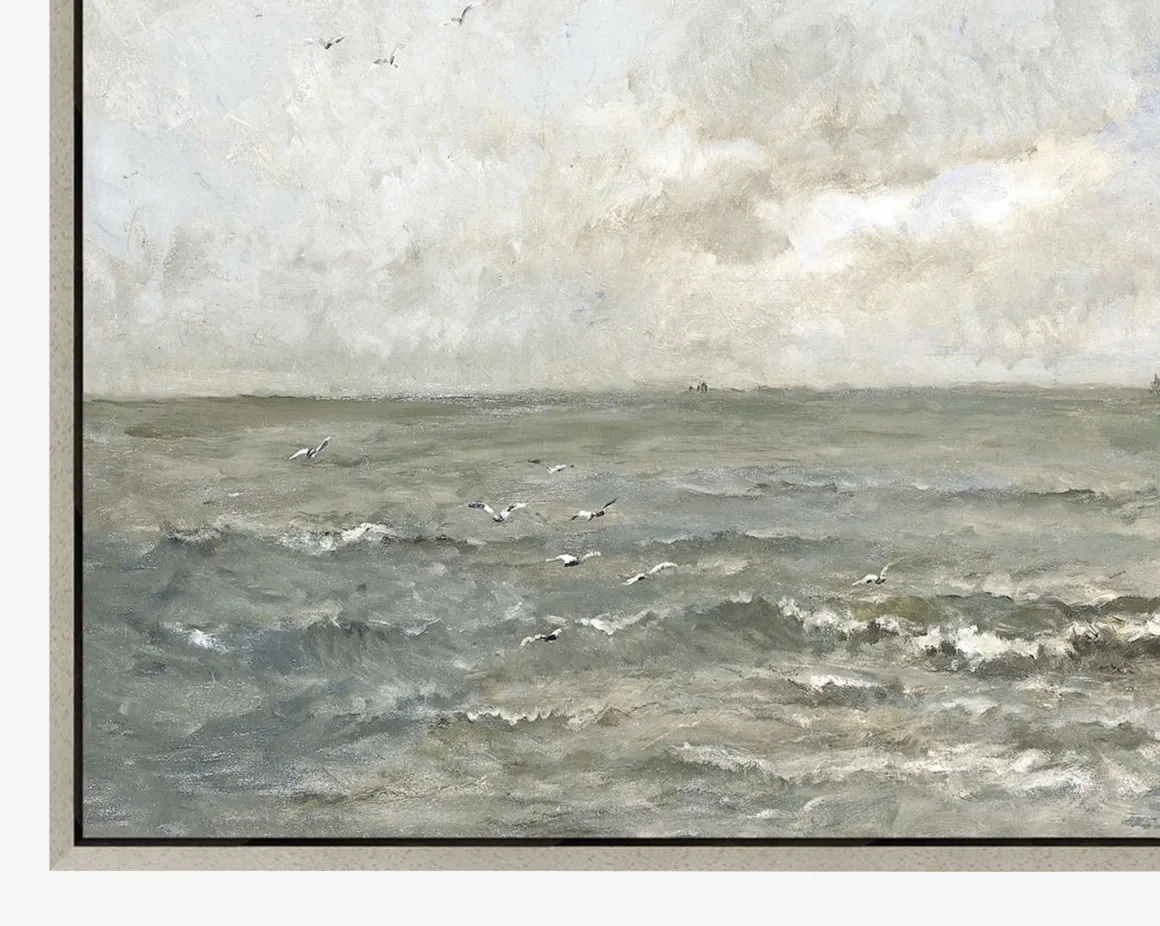 A moody seascape, Cloudy Gray Waters uses tone and detailed brushwork to tell its story. A wood floater frame allows for versatile styling in your home, elevating wall treatments or vignettes.