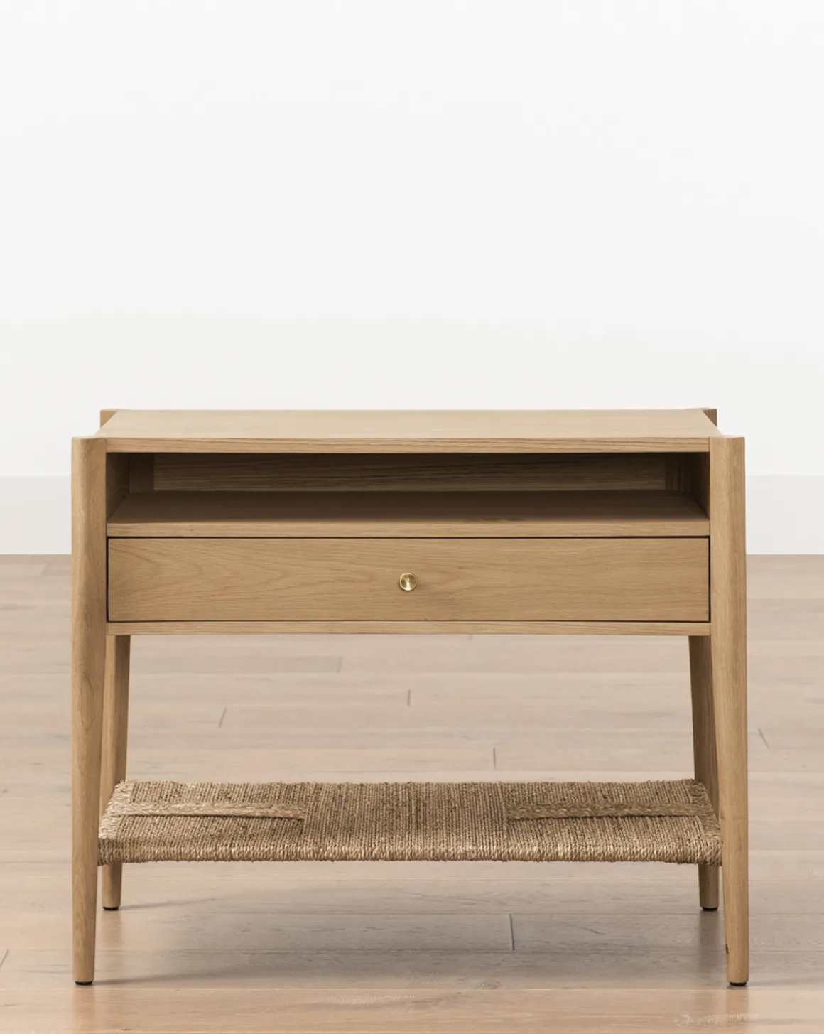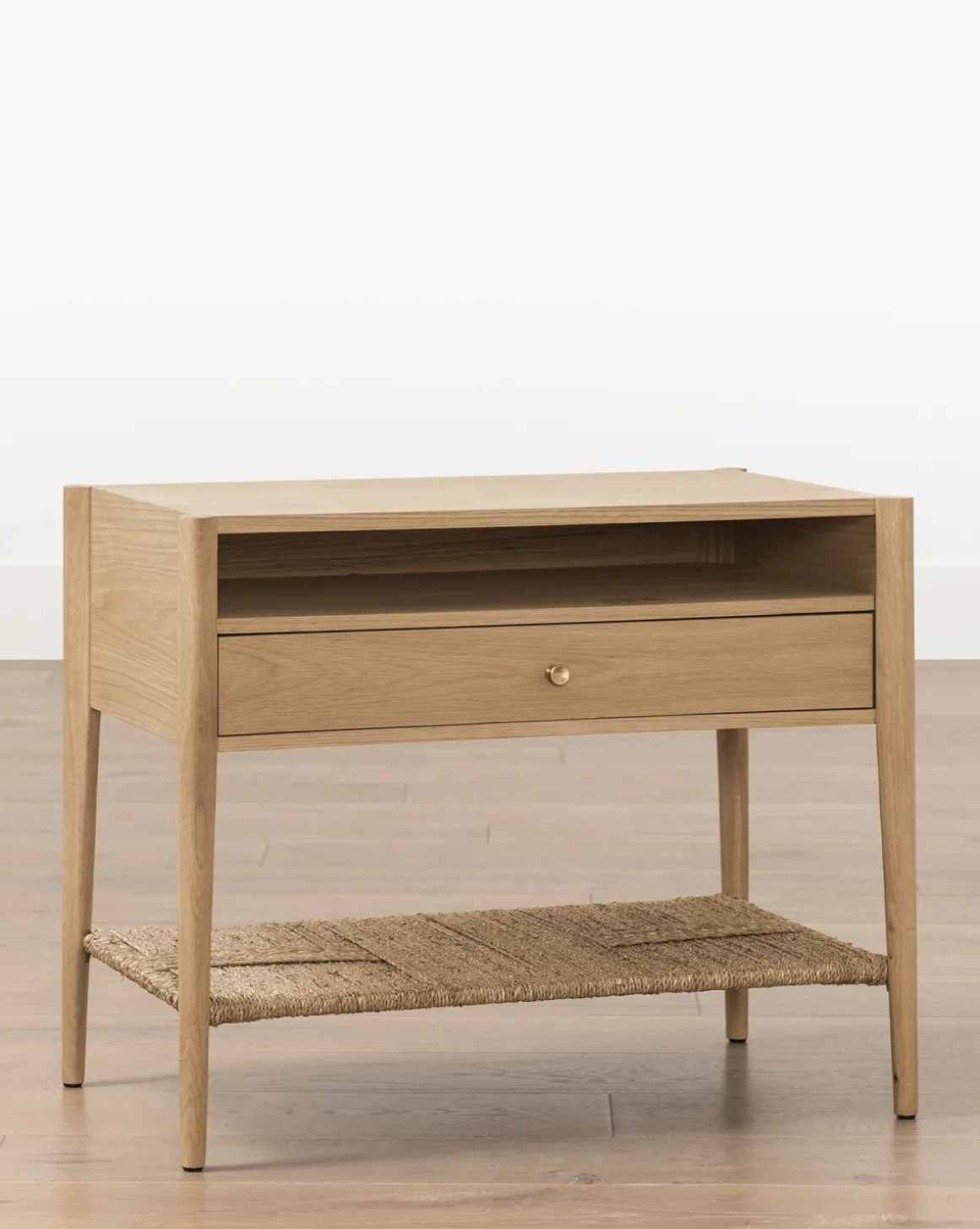 From its open shelving to its soft close drawer, the Dana White Oak Nightstand is all about the details. Crafted from white oak, this elevated but casual nightstand is finished with brass hardware and an endearing woven seagrass shelf.