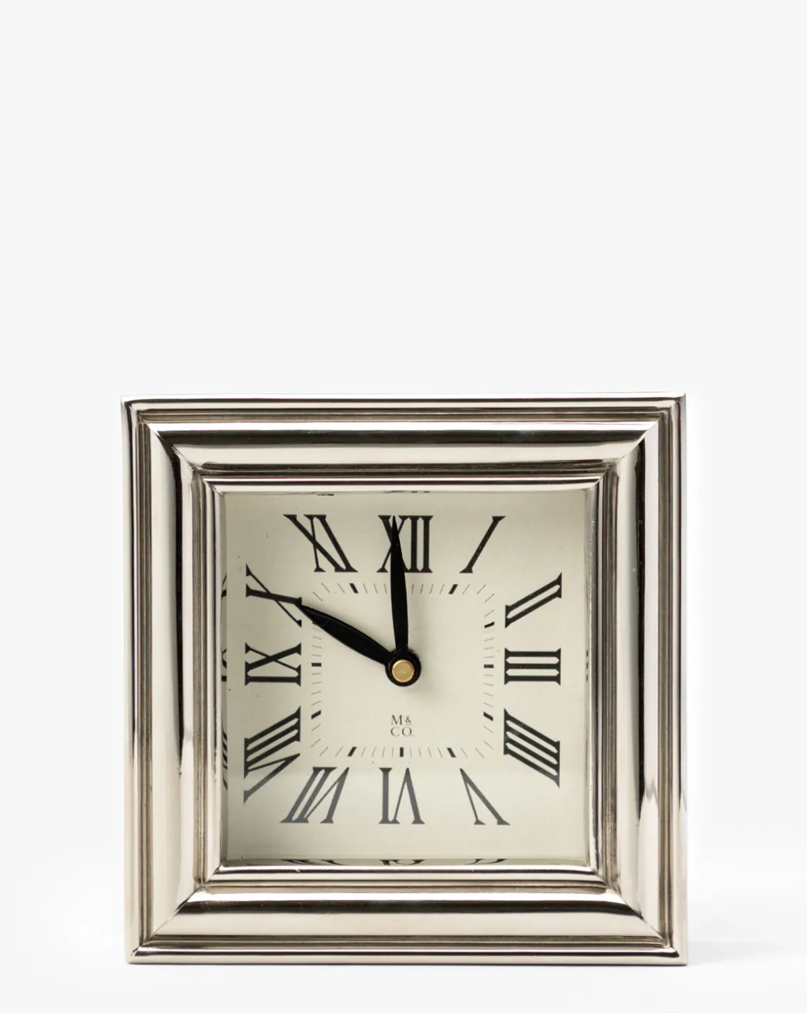 Add a timeless accent to your home with the Draper Clock. Finished in polished nickel, this elegant piece features classic Roman numerals and a refined square silhouette. Perfect for styling on a mantel, shelf, or bedside table to bring a touch of sophisticated charm.