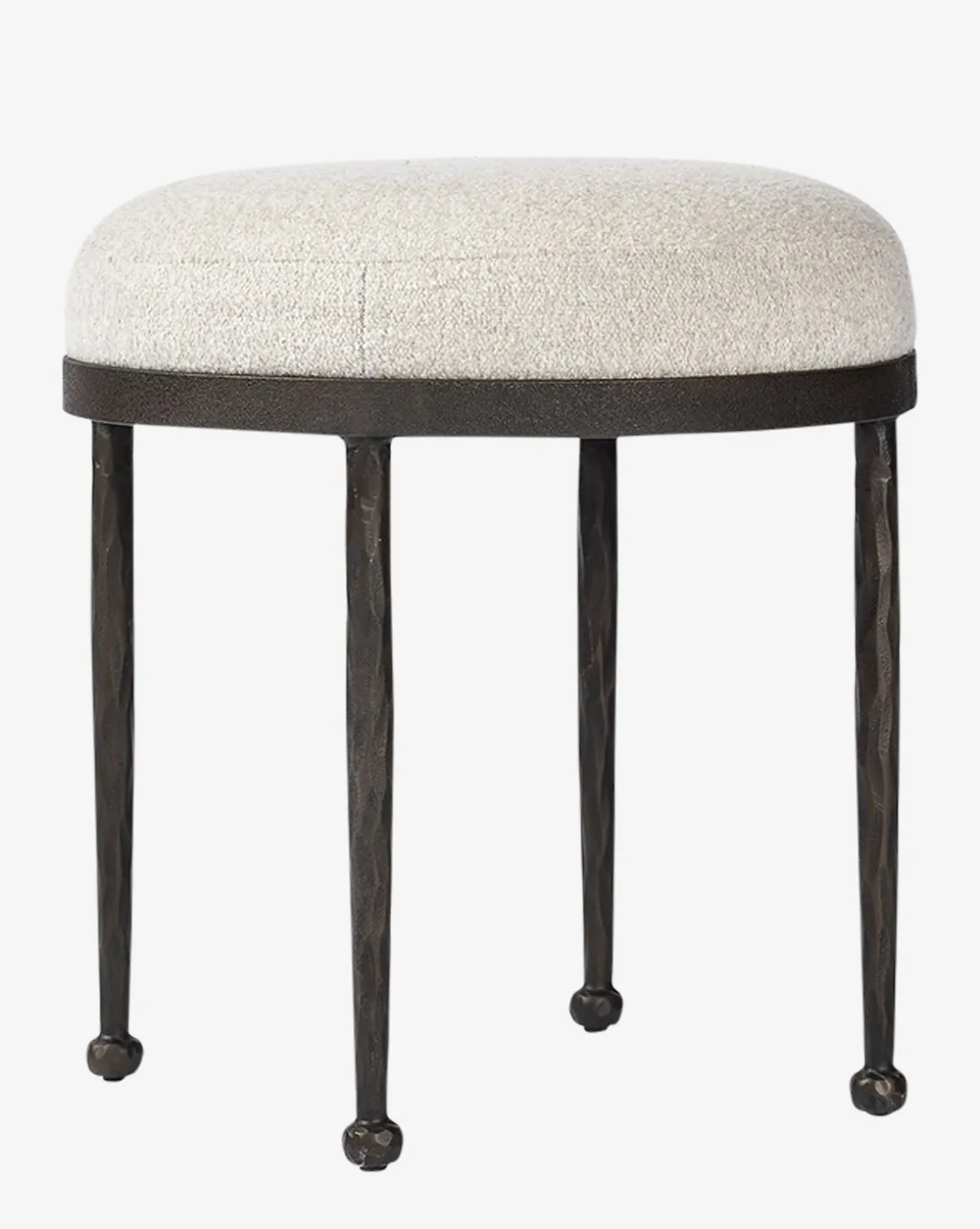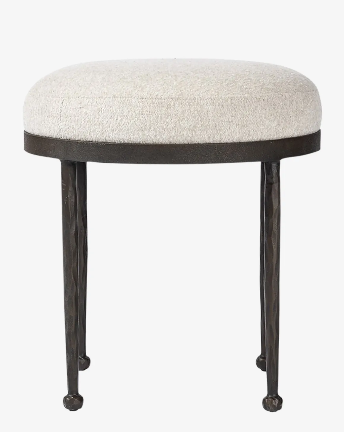 Doubling as a cocktail ottoman, the Emmett Stool is a versatile accent piece that blends form and function. Sleek yet comfortable, the stool features hammered bronze-finished wrought iron legs that support rounded texture-rich upholstery. Add it to any room for a touch of sophisticated warmth.