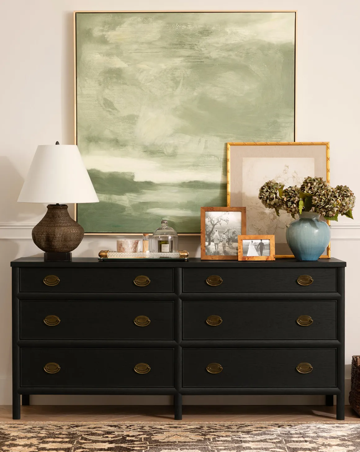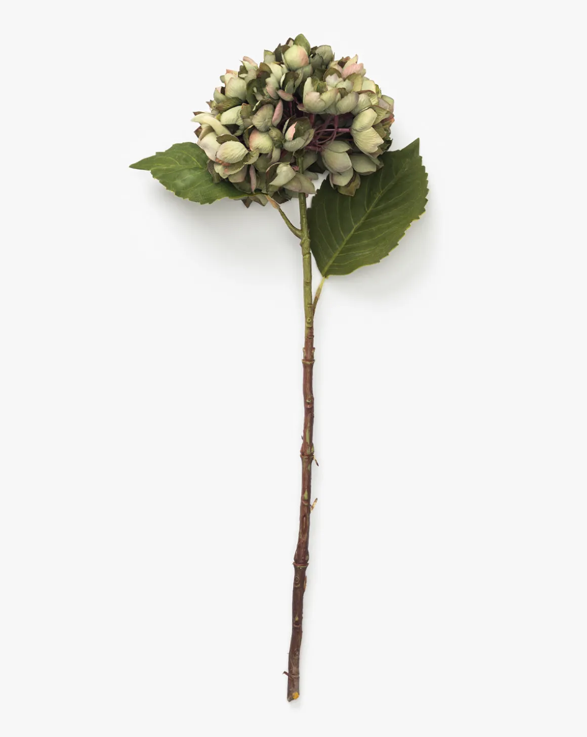 Realistically capturing the artful form and palette of the hydrangea plant, the Green Hydrangea Stem is ideal for styling alone or as part of an arrangement in a vase. Between the delicate green petals and the stem featuring textural leaves, the faux stem brings interest and dimension to your vignettes.