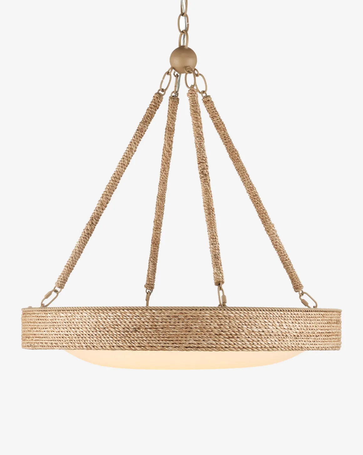 Featuring a streamlined yet organic design and a frame wrapped in natural abaca rope, the Hopscotch Chandelier brings warm light to any room. Displaying a wide glass shade, this chandelier is beautifully balanced.