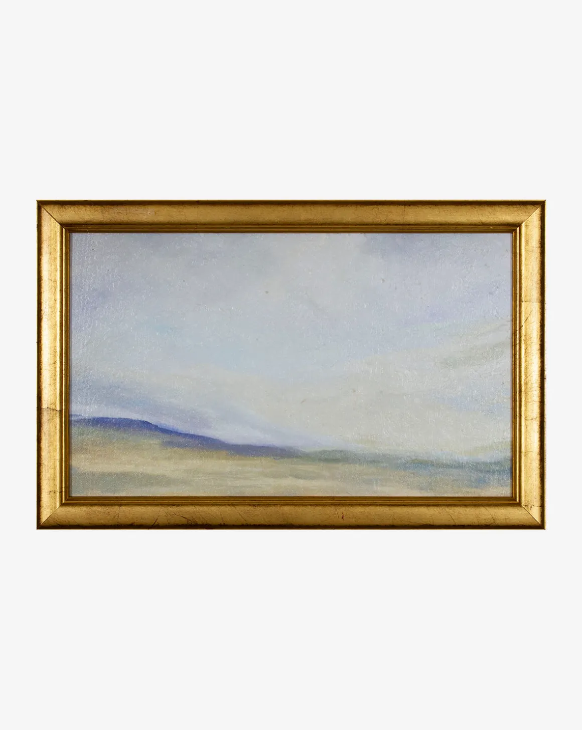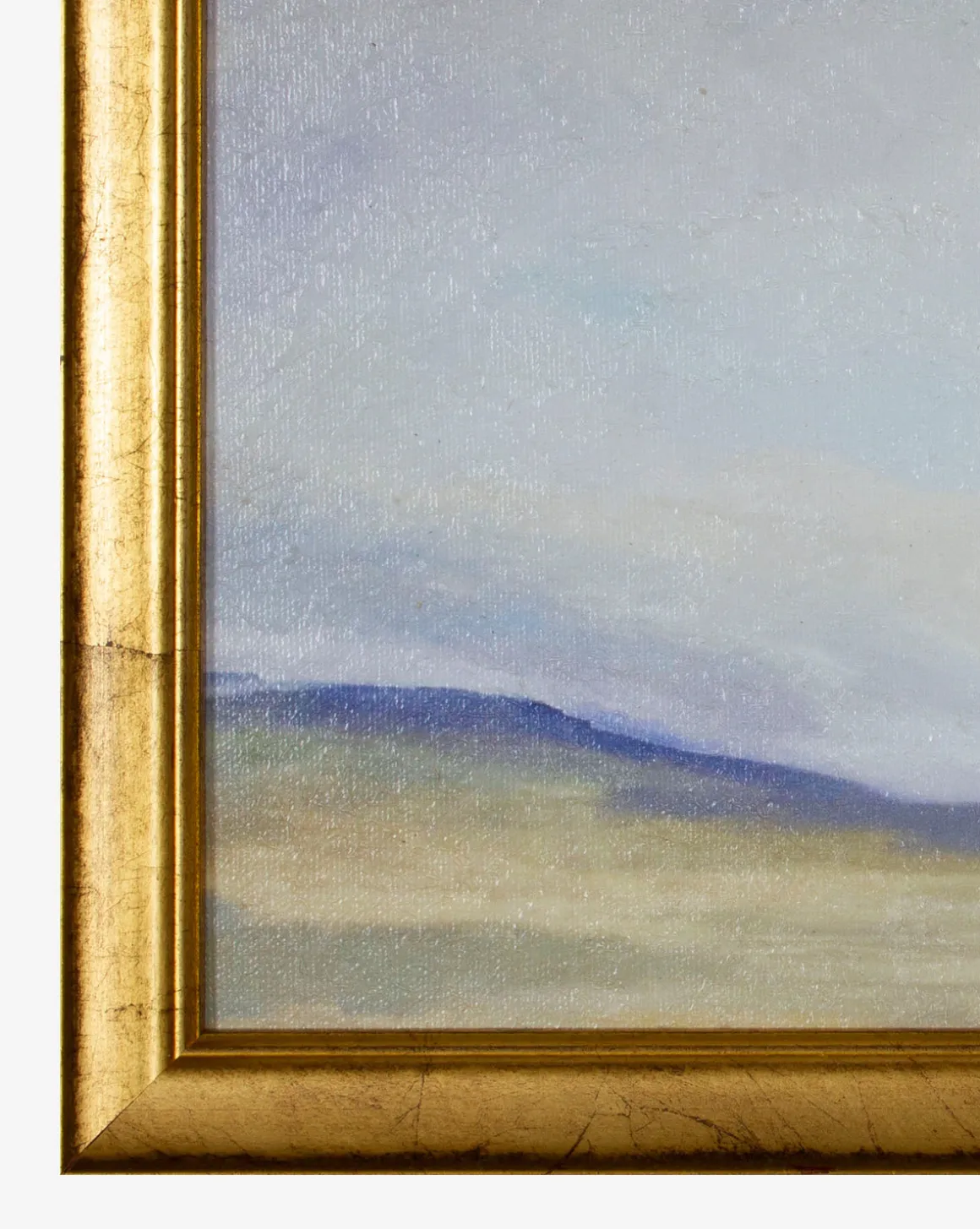 A serene pastel landscape, Indigo Skyline is a beautiful mix of blue and natural tones. A gold wood frame gives the piece a bold presence in your space, elevating wall treatments or dresser vignettes.