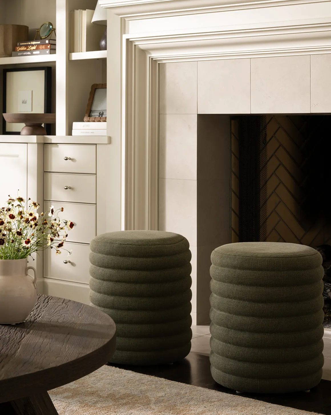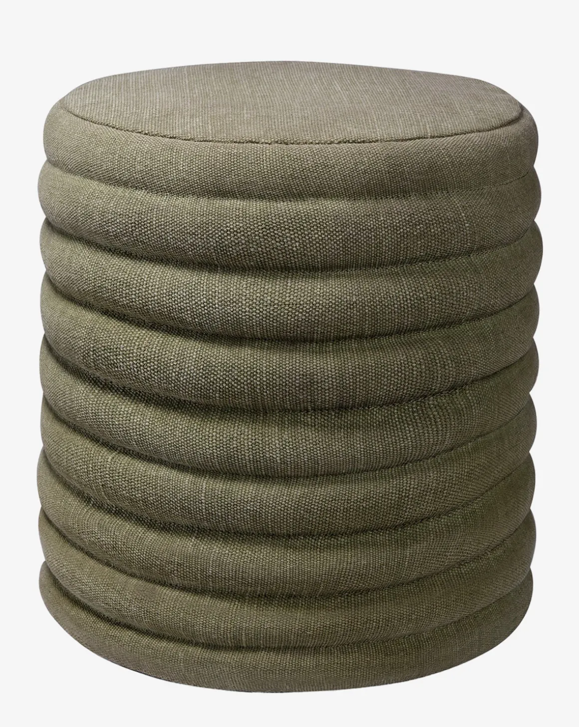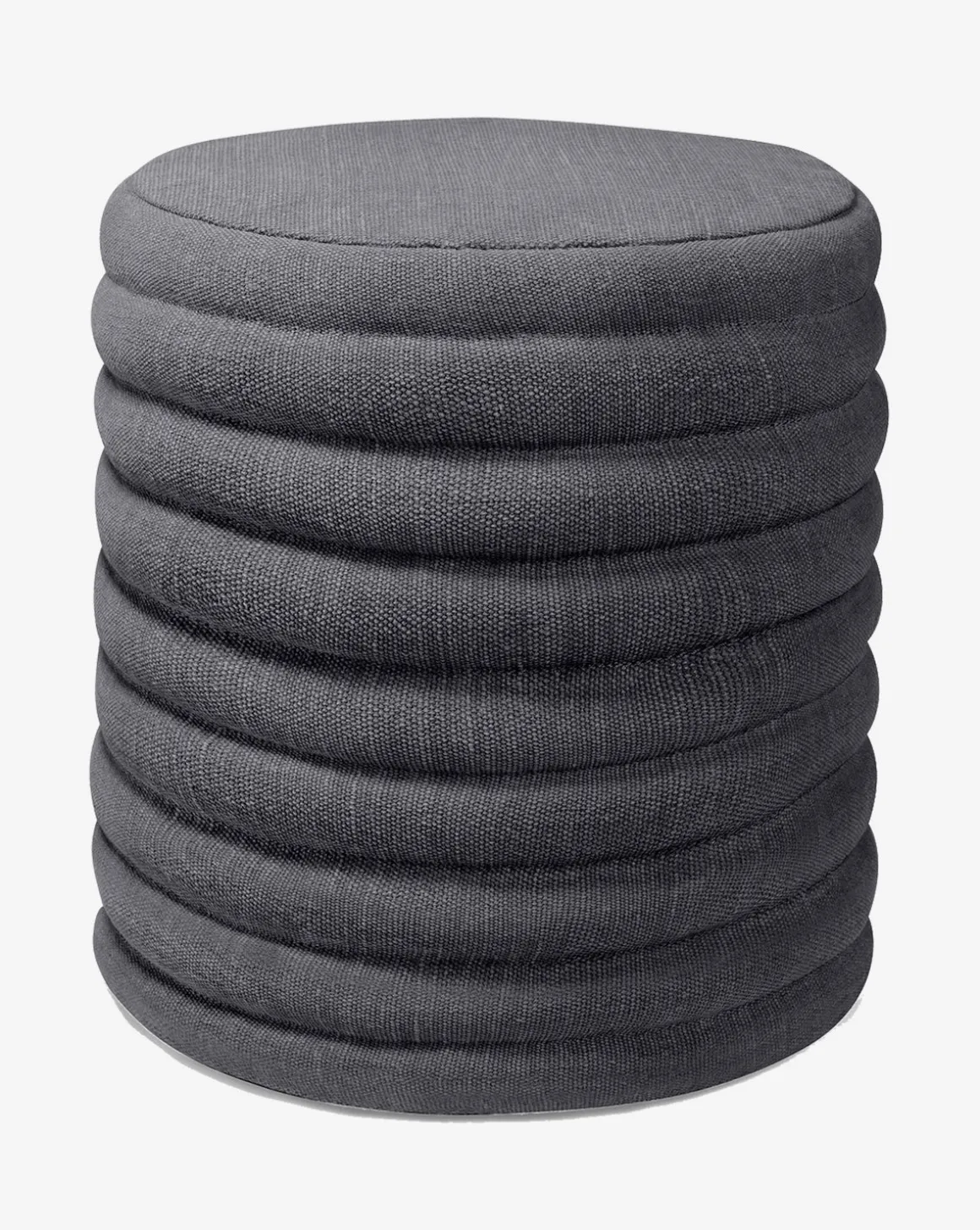 Crafted from cotton jute, the Jefferson Stool has a sophisticated, cylindrical form and quilted feel. Its form is abstract and comfortable and unique design that gives a subtle nod to mid-century styles.
