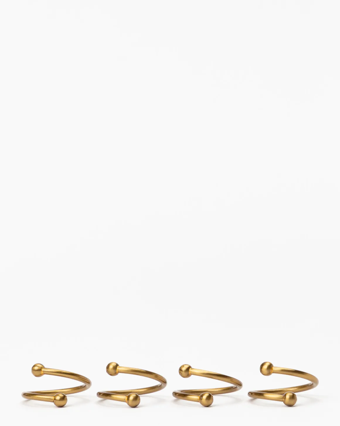 A simple design of slender brass, the Kinne Metal Napkin Rings are bold yet casual. Polished with a smooth texture and detailed with small brass knobs at each end, these napkin rings are an effortless way to elevate even the most casual place settings.