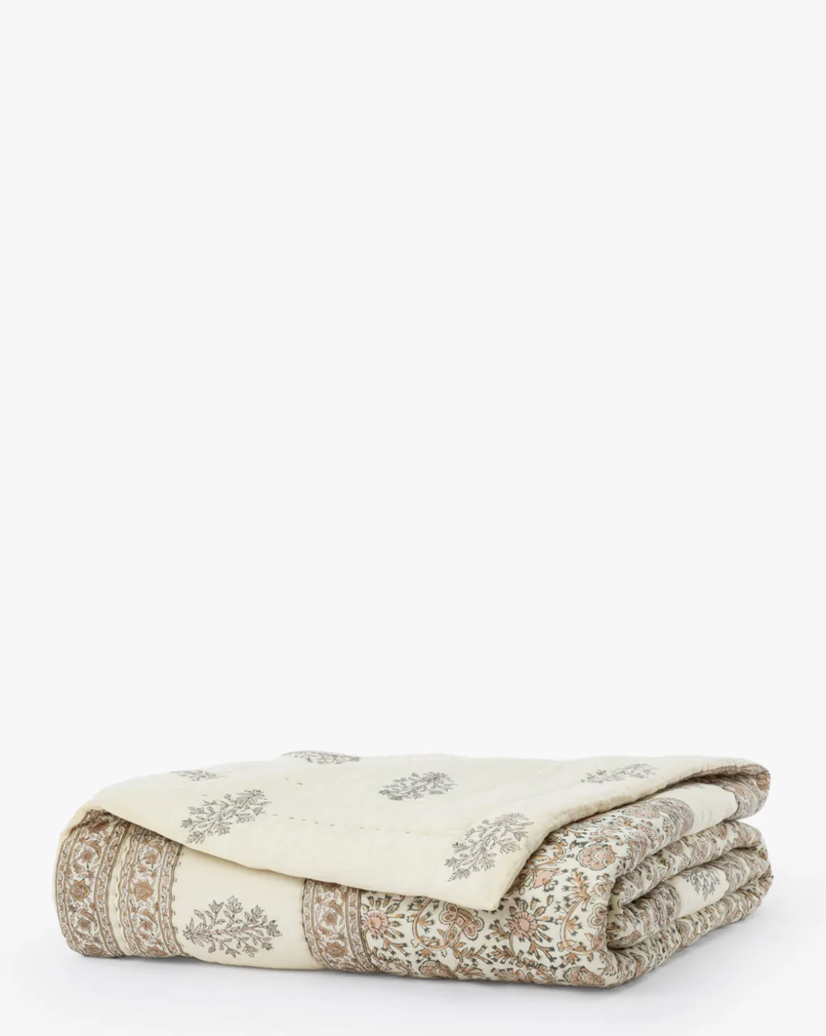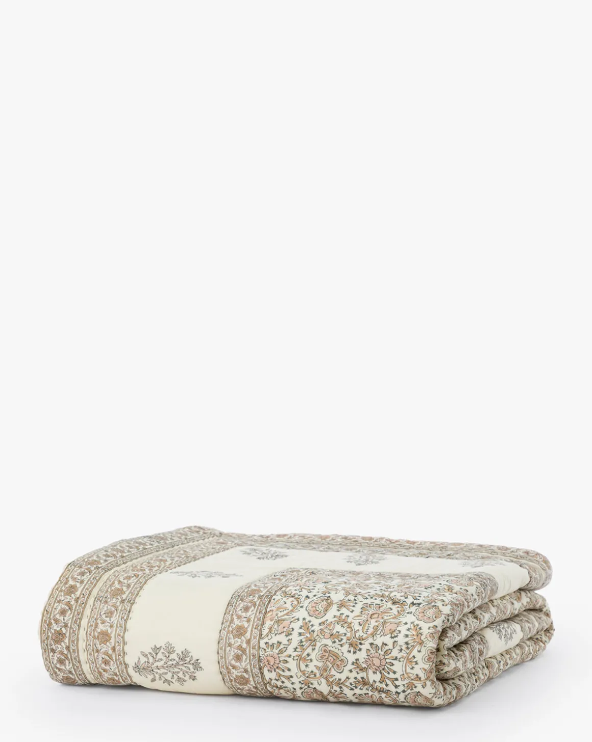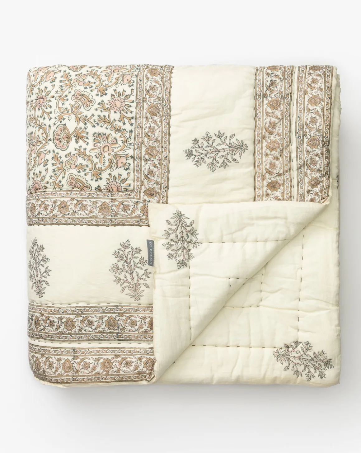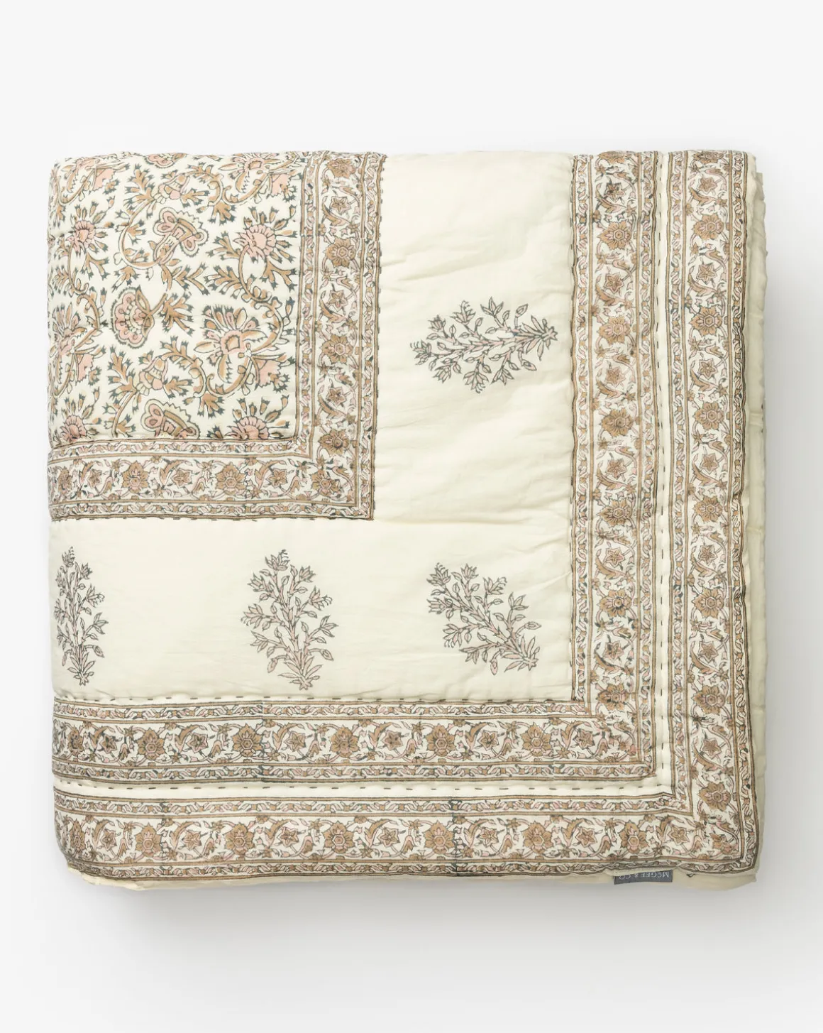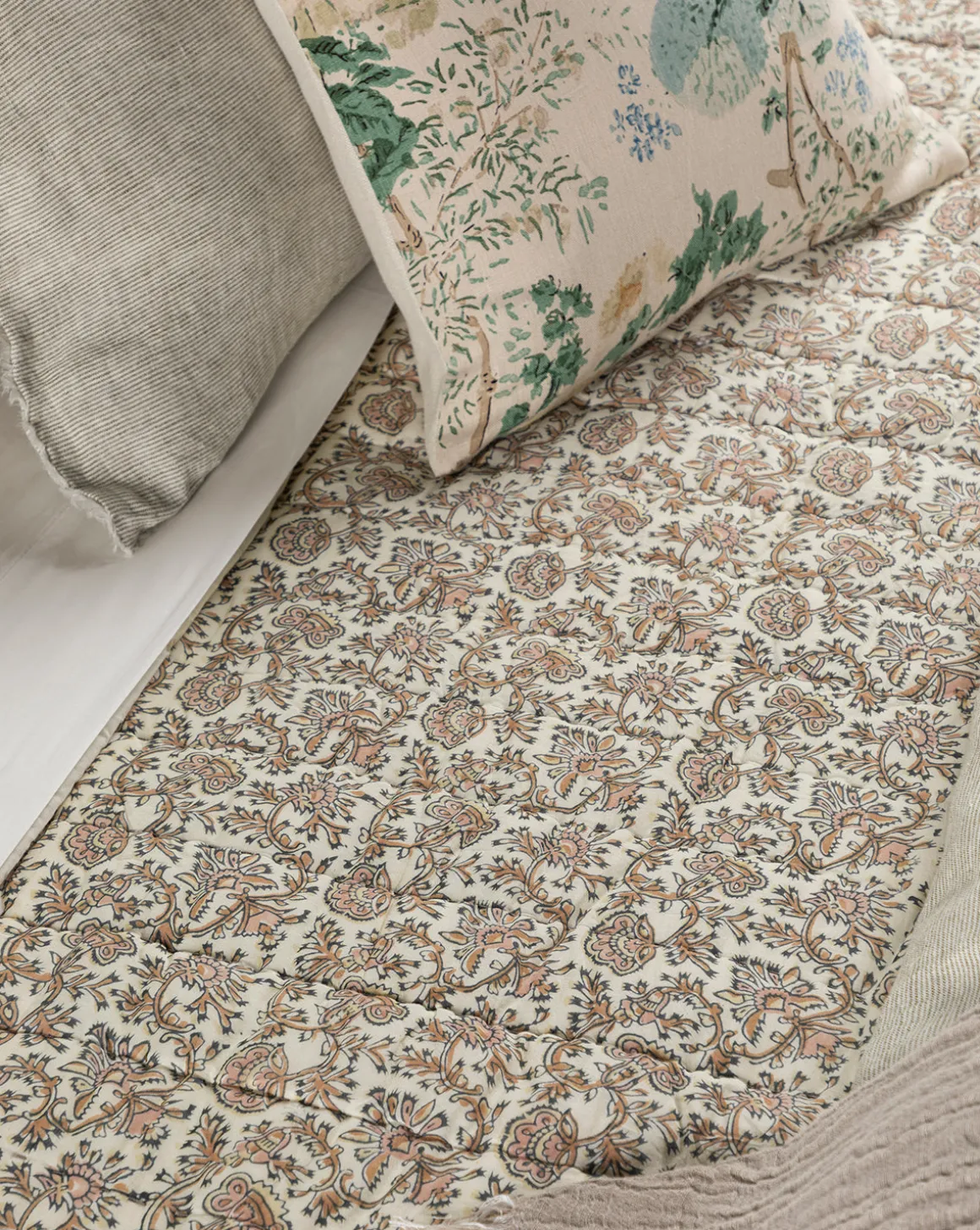 The Leander Quilt is a romantic addition to bedding, featuring an intricate block print design. Made from 100% cotton, the intricate and warm motif lends visual texture and an elegant feel to layer with your bedding. This block print quilt speaks to its artisanship in every detail.
