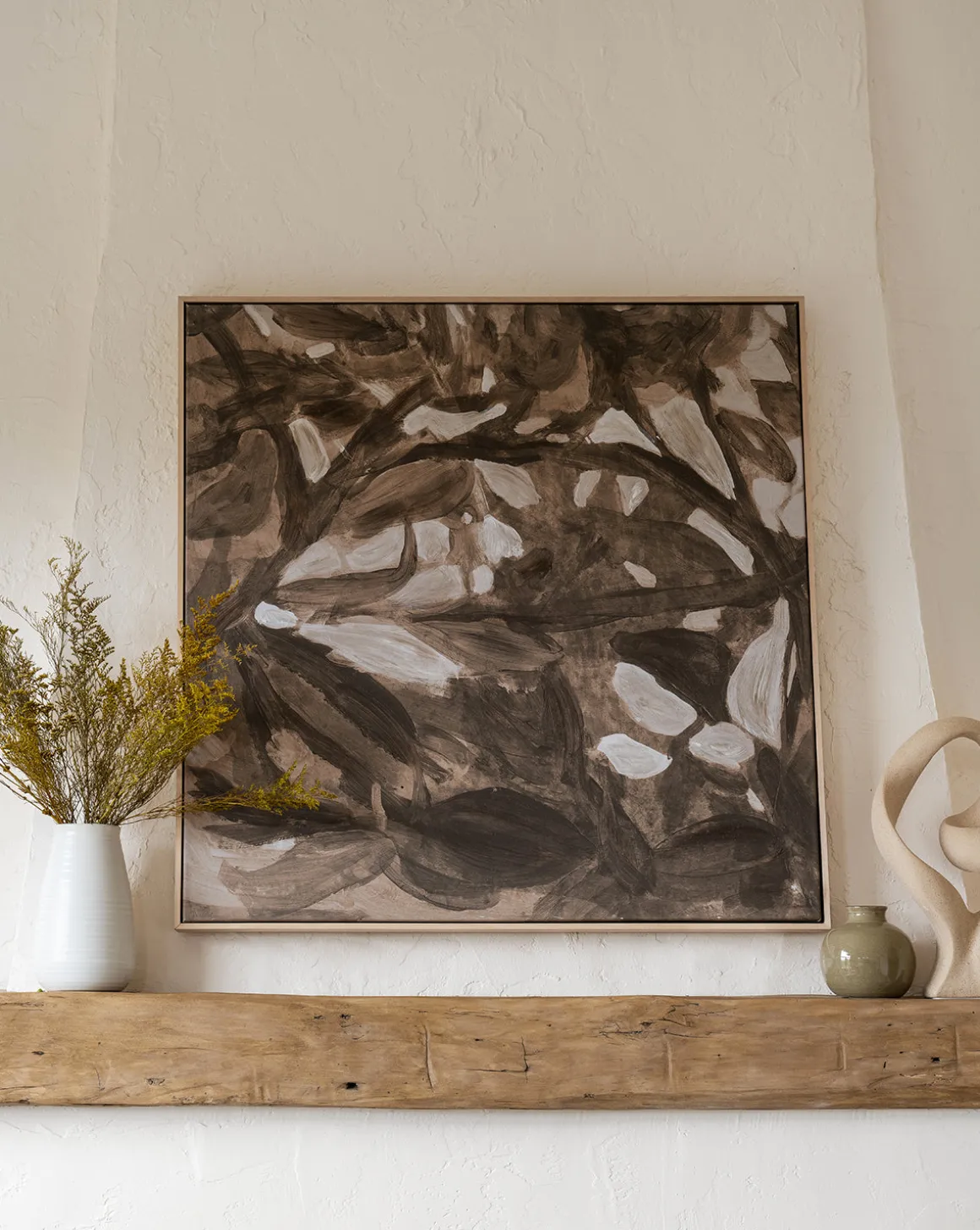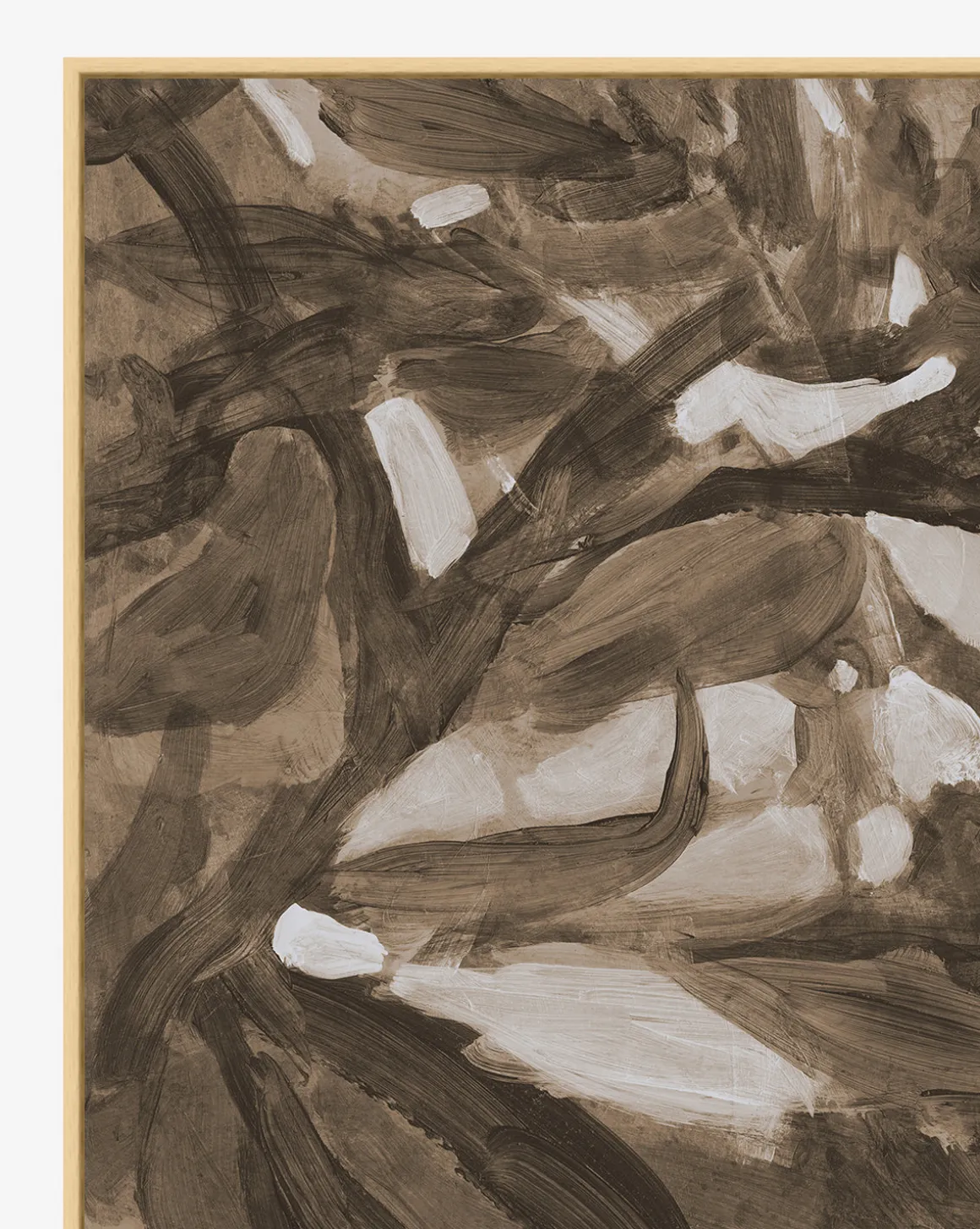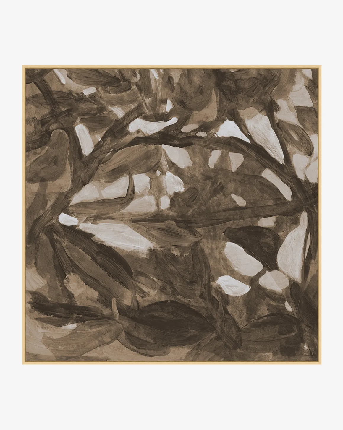 Giclee printed on canvas in a natural wood float frame, Light of Summer is an abstract piece printed in medium scale. In a neutral palette of rich brown and cream, the piece abstractly captures the feel of sunshine peeking through trees. Its warm tone and scale suits it perfectly for a bold accent to grids or to fill smaller spaces with interest.