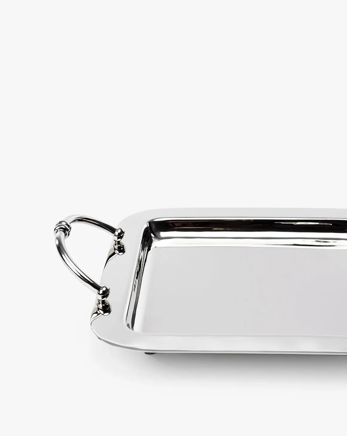 A beautiful and bold accessory, the Lionel Tray adds modern detail to your decorative vignettes with its nickel finish. The shallow tray with large handles brings practical elegance to coffee tables or dressers.
