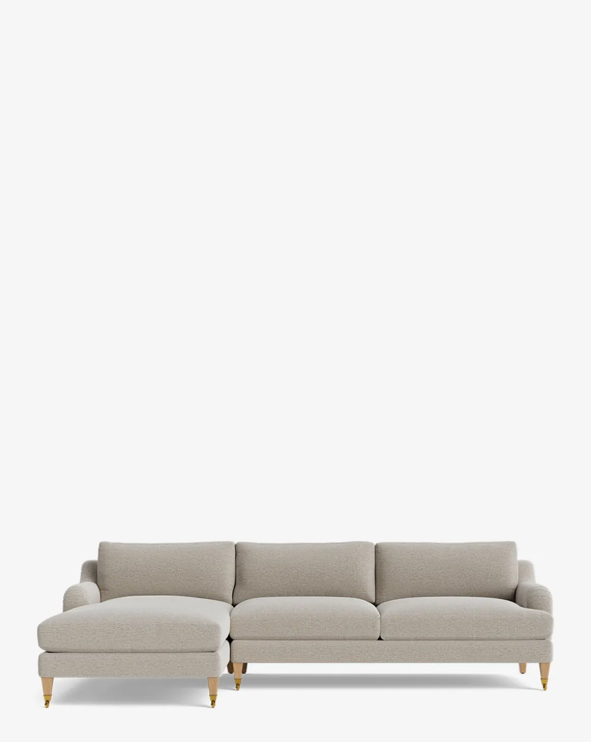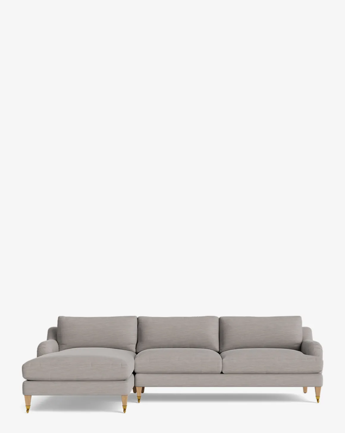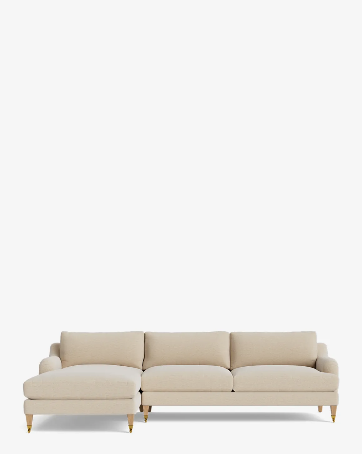 Our Lucille English Roll Arm Left Chaise Sectional 107″ is a modern approach to a traditional design. Crafted with luxurious comfort in mind, its classic format features a down wrapped cushion for a perfectly stuffed look and feel. A bench-made alder wood frame adds durability to the design, as four oak wood tapered legs give this sectional a stately presence. Completely customizable in a wide array of fabrics, make the piece your own with either a soft linen, or high performance crypton.