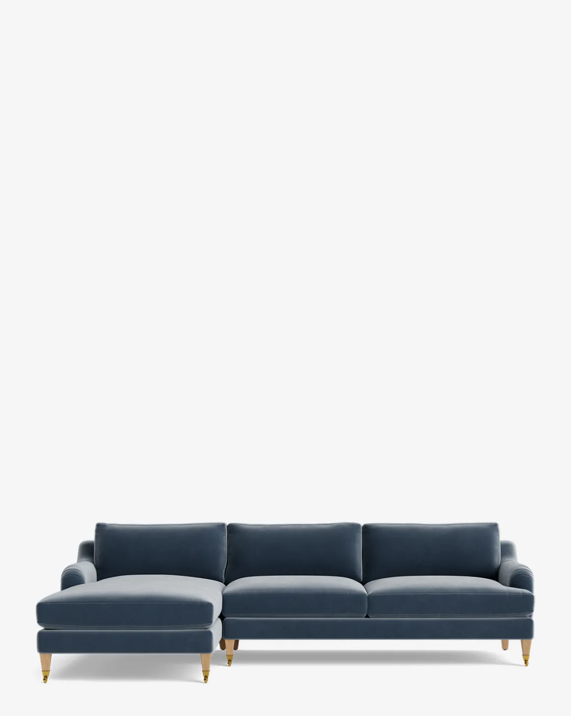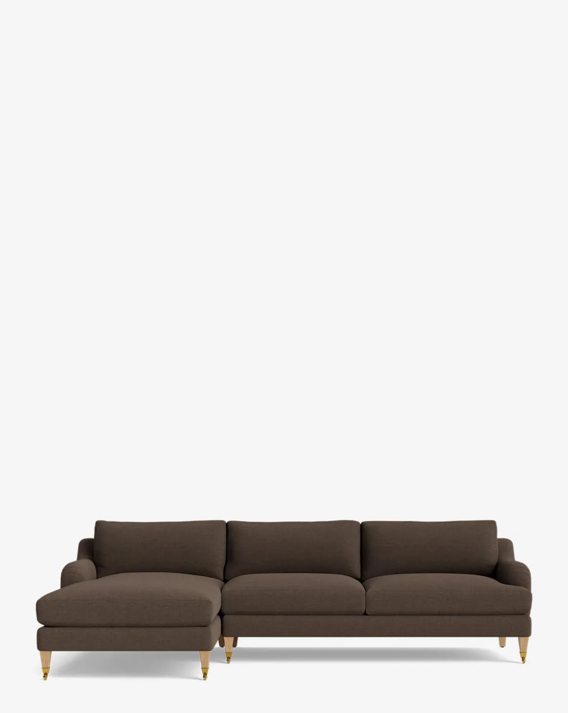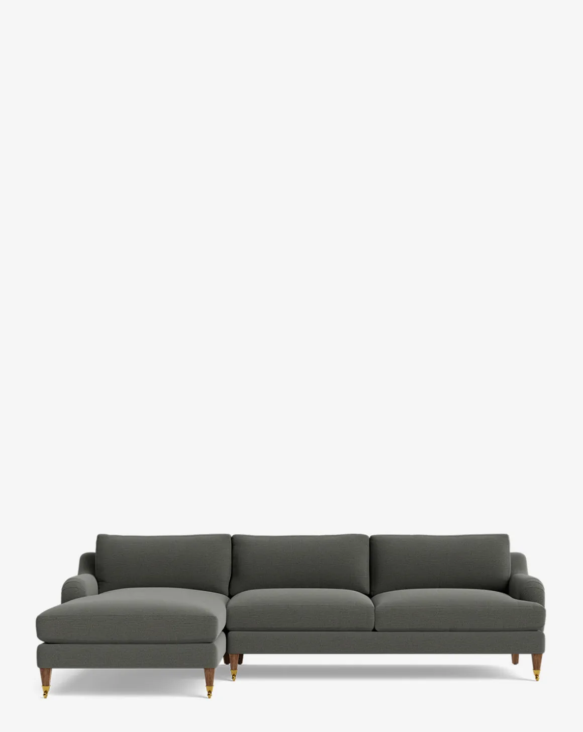 Our Lucille English Roll Arm Left Chaise Sectional 107″ is a modern approach to a traditional design. Crafted with luxurious comfort in mind, its classic format features a down wrapped cushion for a perfectly stuffed look and feel. A bench-made alder wood frame adds durability to the design, as four oak wood tapered legs give this sectional a stately presence. Completely customizable in a wide array of fabrics, make the piece your own with either a soft linen, or high performance crypton.