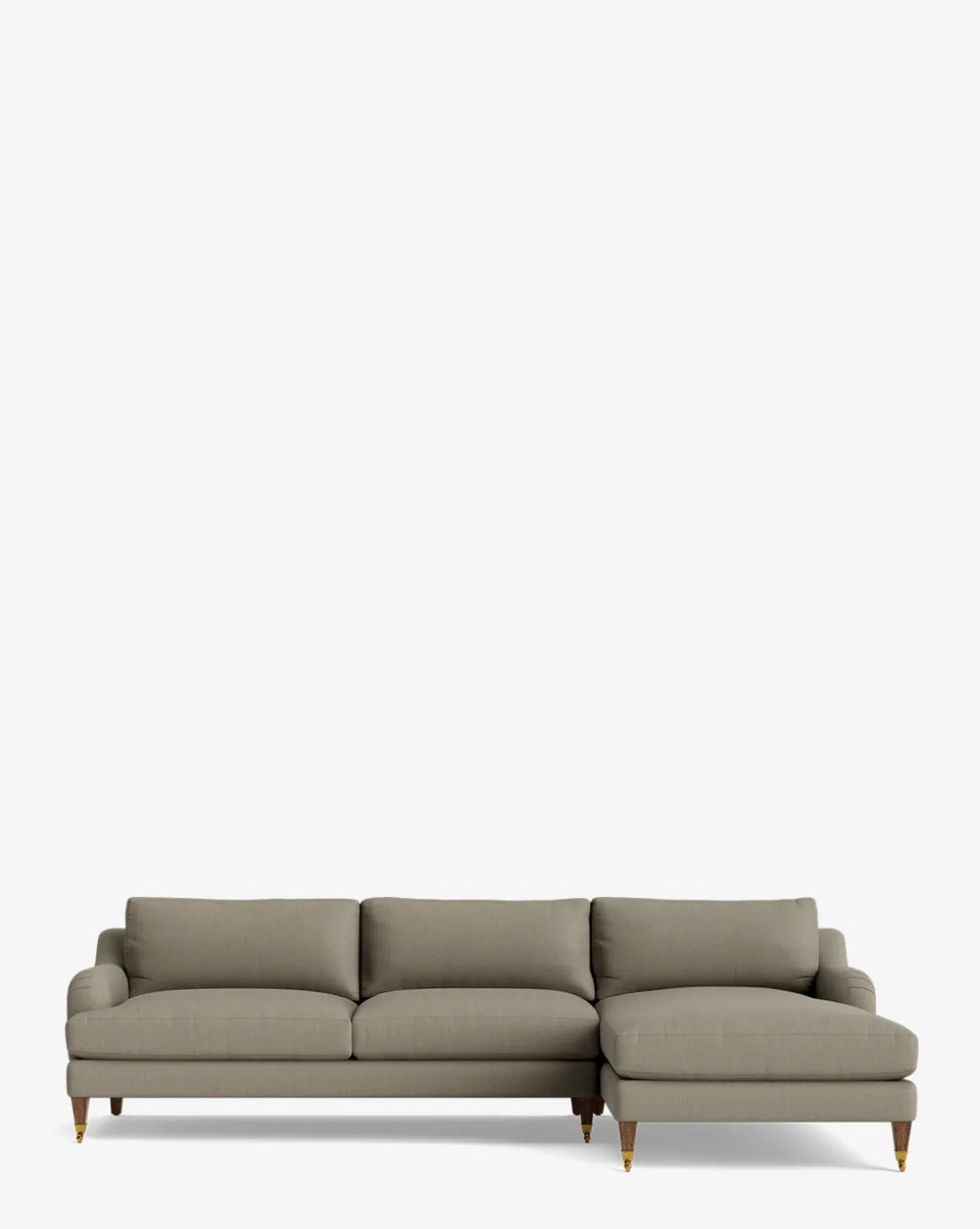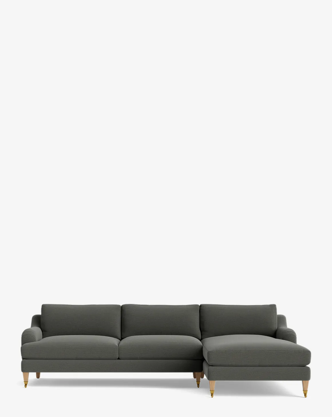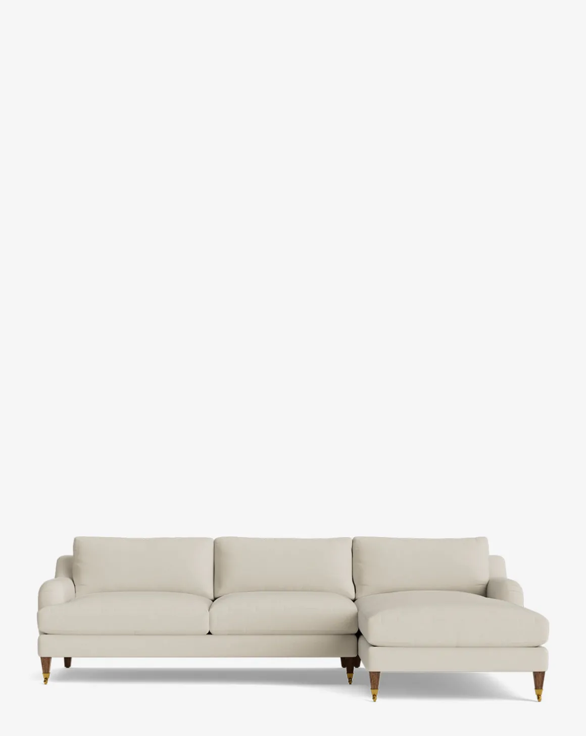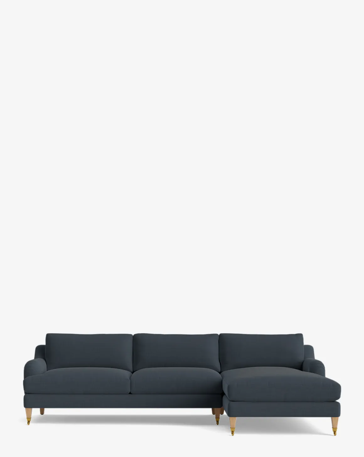 Our Lucille English Roll Arm Right Chaise Sectional 107″ is a modern approach to a traditional design. Crafted with luxurious comfort in mind, its classic format features a down wrapped cushion for a perfectly stuffed look and feel. A bench-made alder wood frame adds durability to the design, as four oak wood tapered legs give this sectional a stately presence. Completely customizable in a wide array of fabrics, make the piece your own with either a soft linen, or high performance crypton.