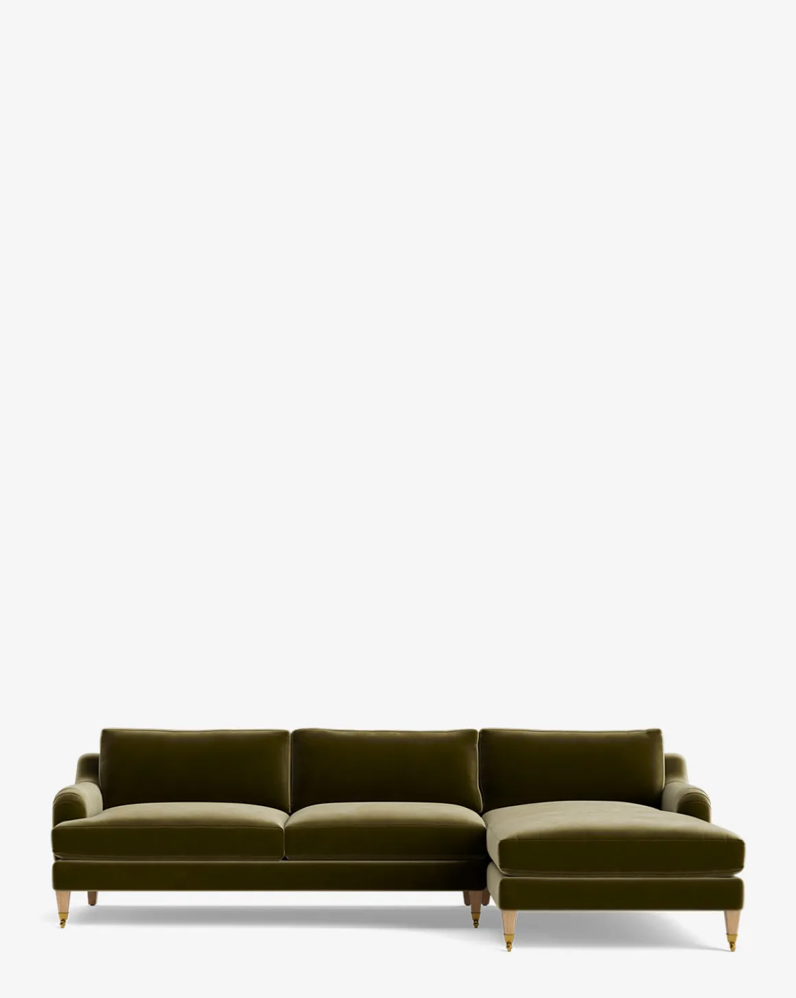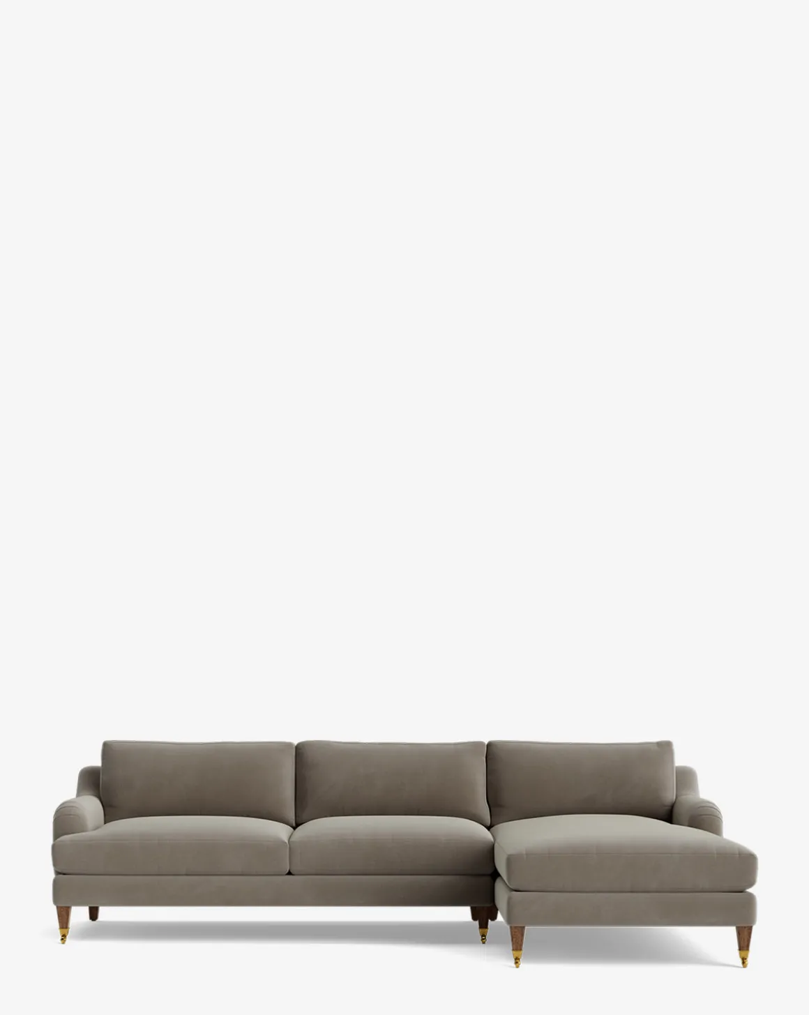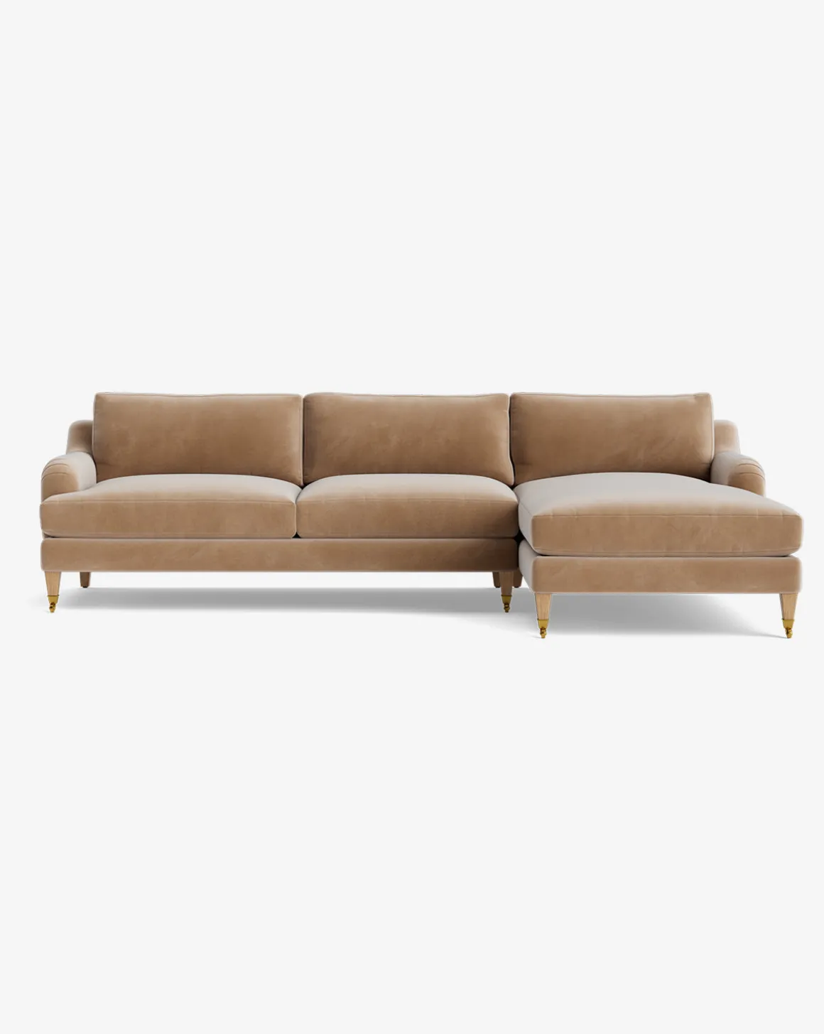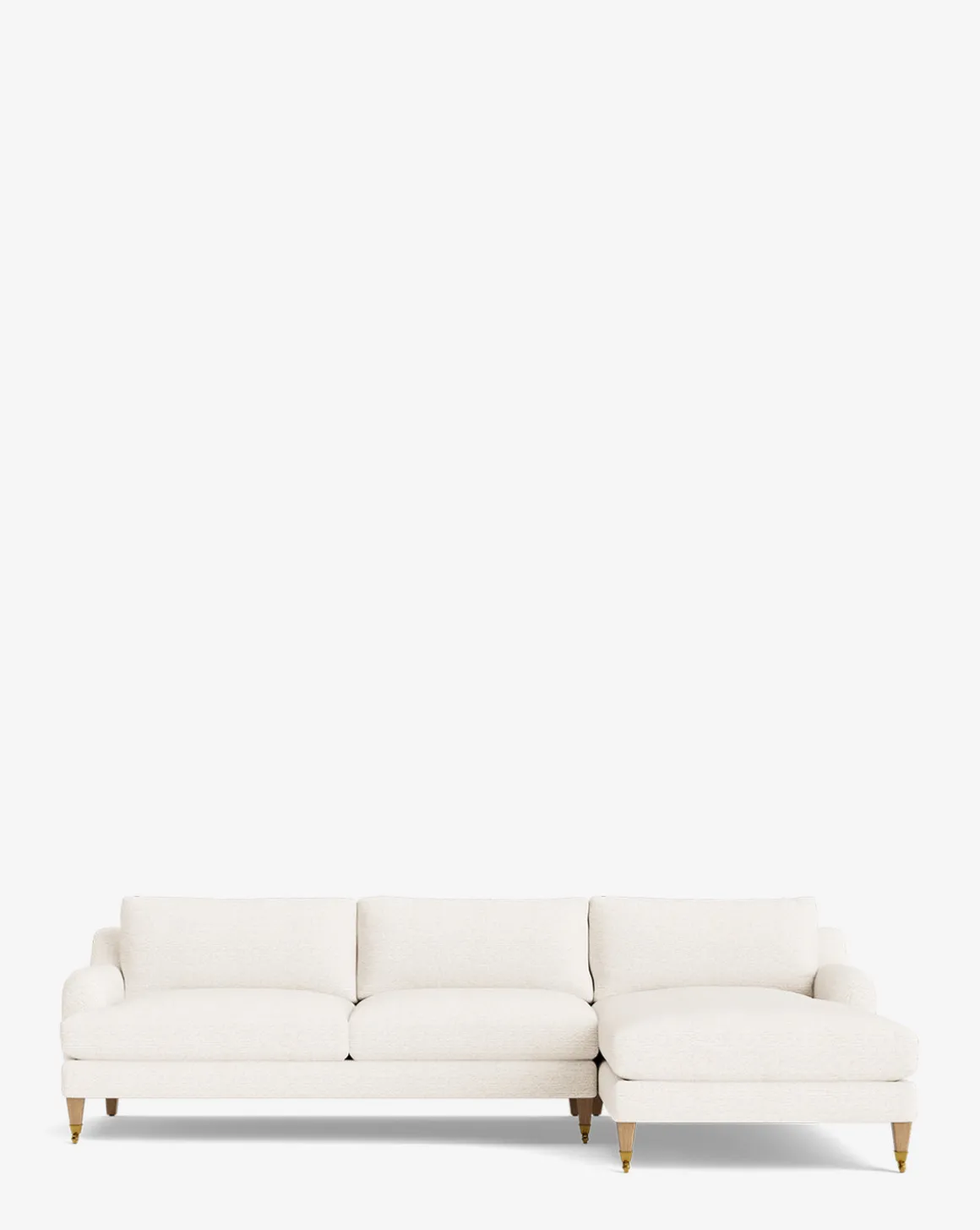 Our Lucille English Roll Arm Right Chaise Sectional 107″ is a modern approach to a traditional design. Crafted with luxurious comfort in mind, its classic format features a down wrapped cushion for a perfectly stuffed look and feel. A bench-made alder wood frame adds durability to the design, as four oak wood tapered legs give this sectional a stately presence. Completely customizable in a wide array of fabrics, make the piece your own with either a soft linen, or high performance crypton.