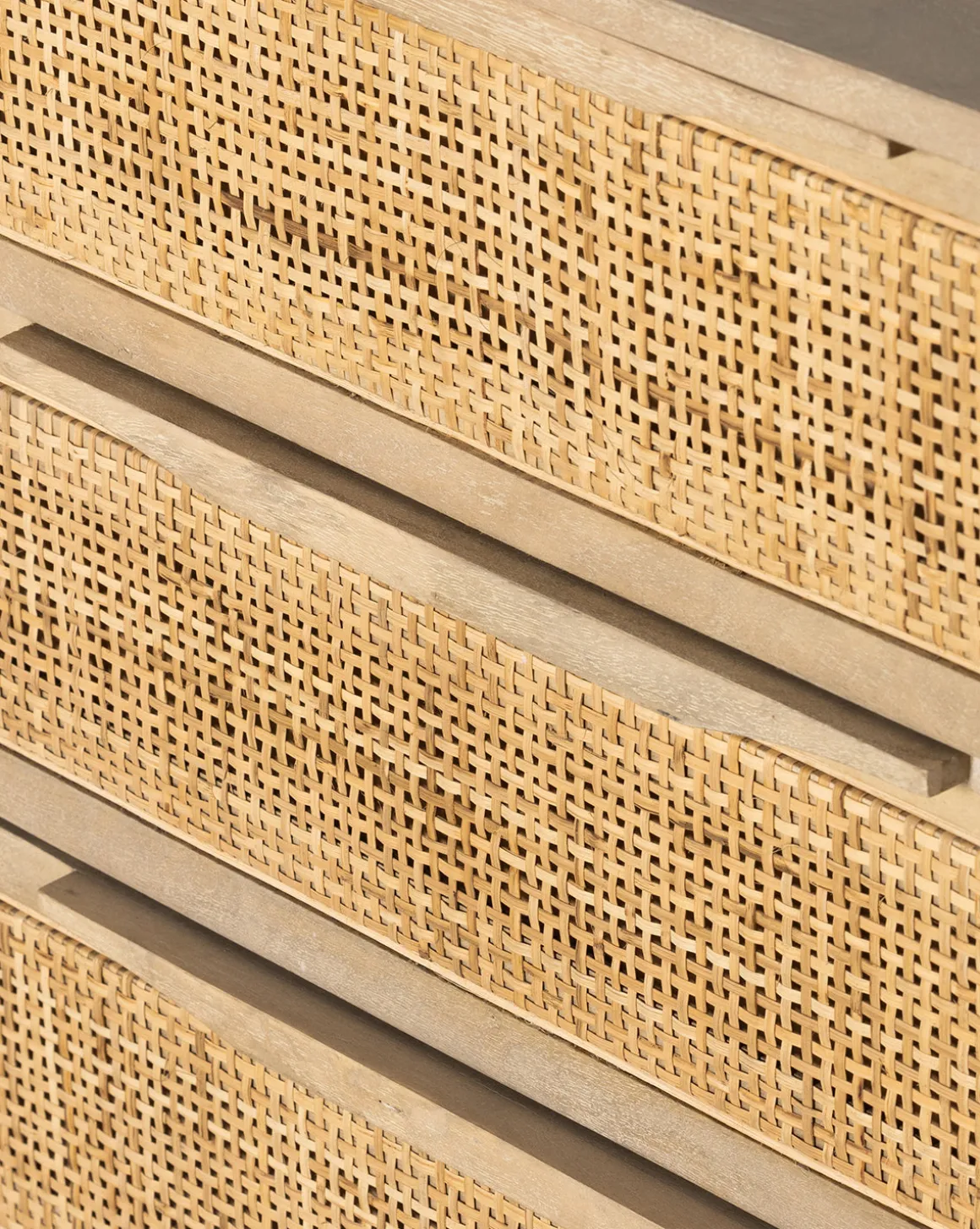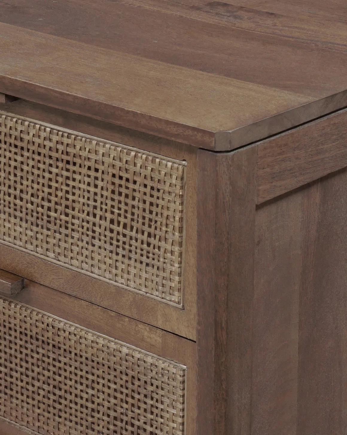Crafted from solid mango wood, the Margaery Nightstand beautifully mixes materials in a simple design. Subtle details elevate the presence of this nightstand, with the smooth frame contrasted by three inset woven cane doors.
