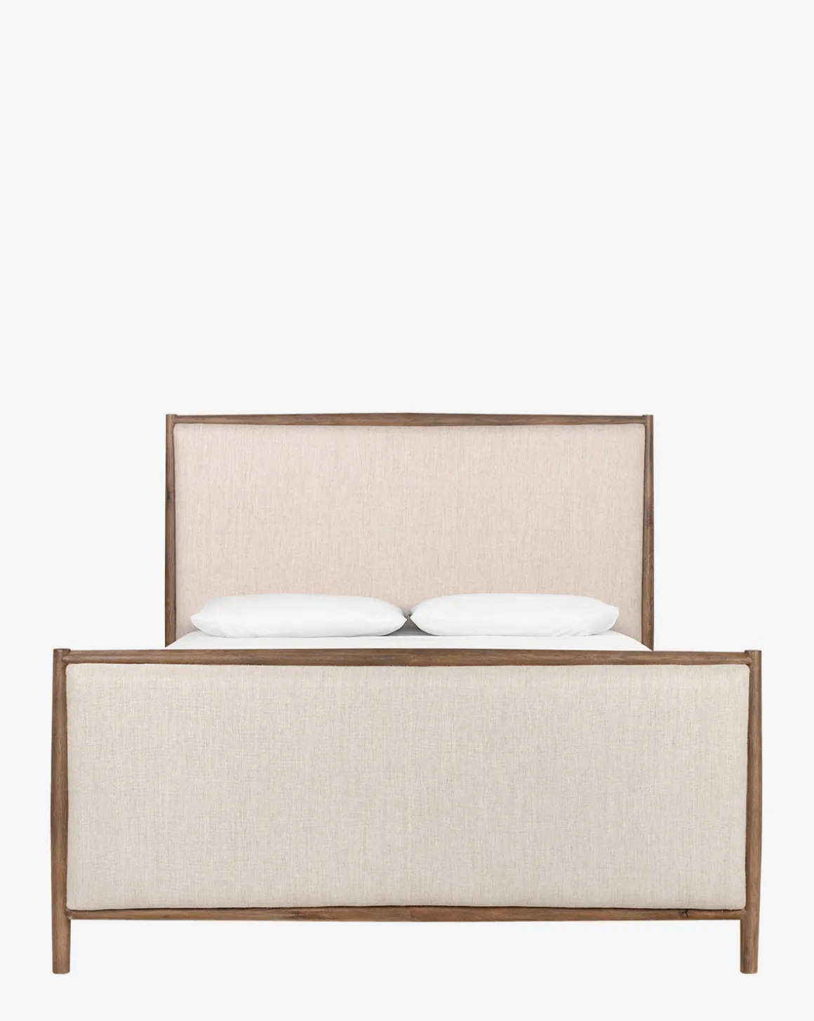 Made from a stunning mix of materials, the Maxen Bed brings modern design to the forefront of your bedroom. Its oak frame features a weathered finish that brings welcome contrast to the natural fabric of the headboard and footboard.