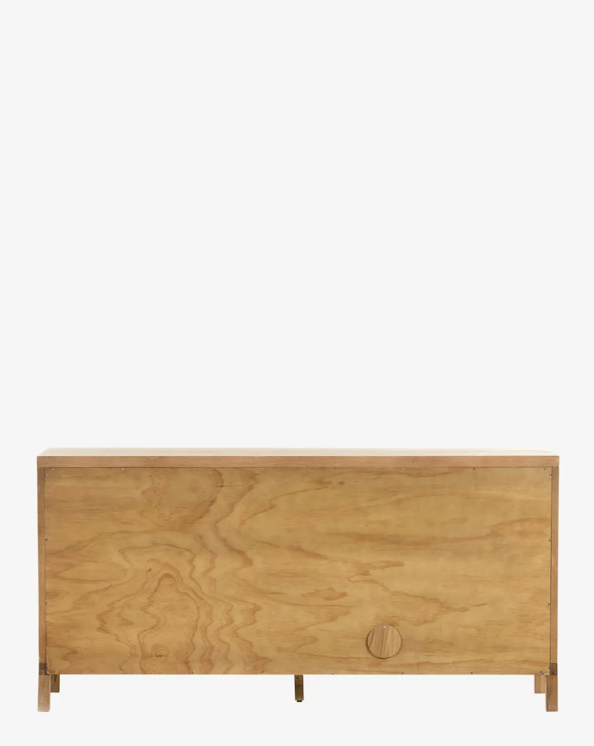 Natural caning and honey-finished oak give the Mora Sideboard its endearing mid-century style. Behind doors of inset, arched caning detail sits roomy interior shelving and rear cutouts for cord management. Completed with block wood handles, the Mora Sideboard highlights natural textures and material for an elevated take on a playful piece.