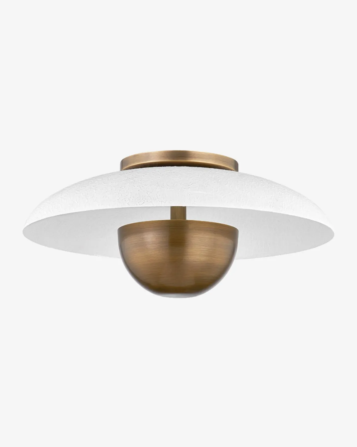 In a classic design, the thoughtful mix of materials in the Noah Flush Mount gives it a unique beauty. The round and shapely flush mount is made from patina brass and white gesso, bringing sophisticated detail to your space.