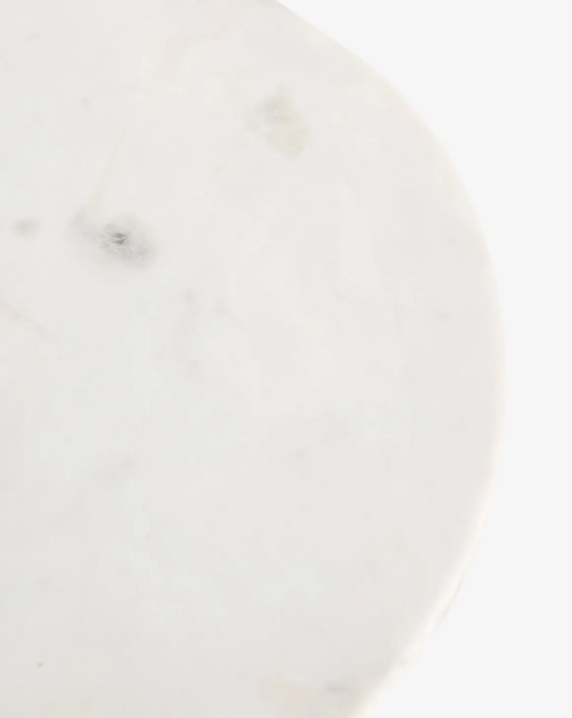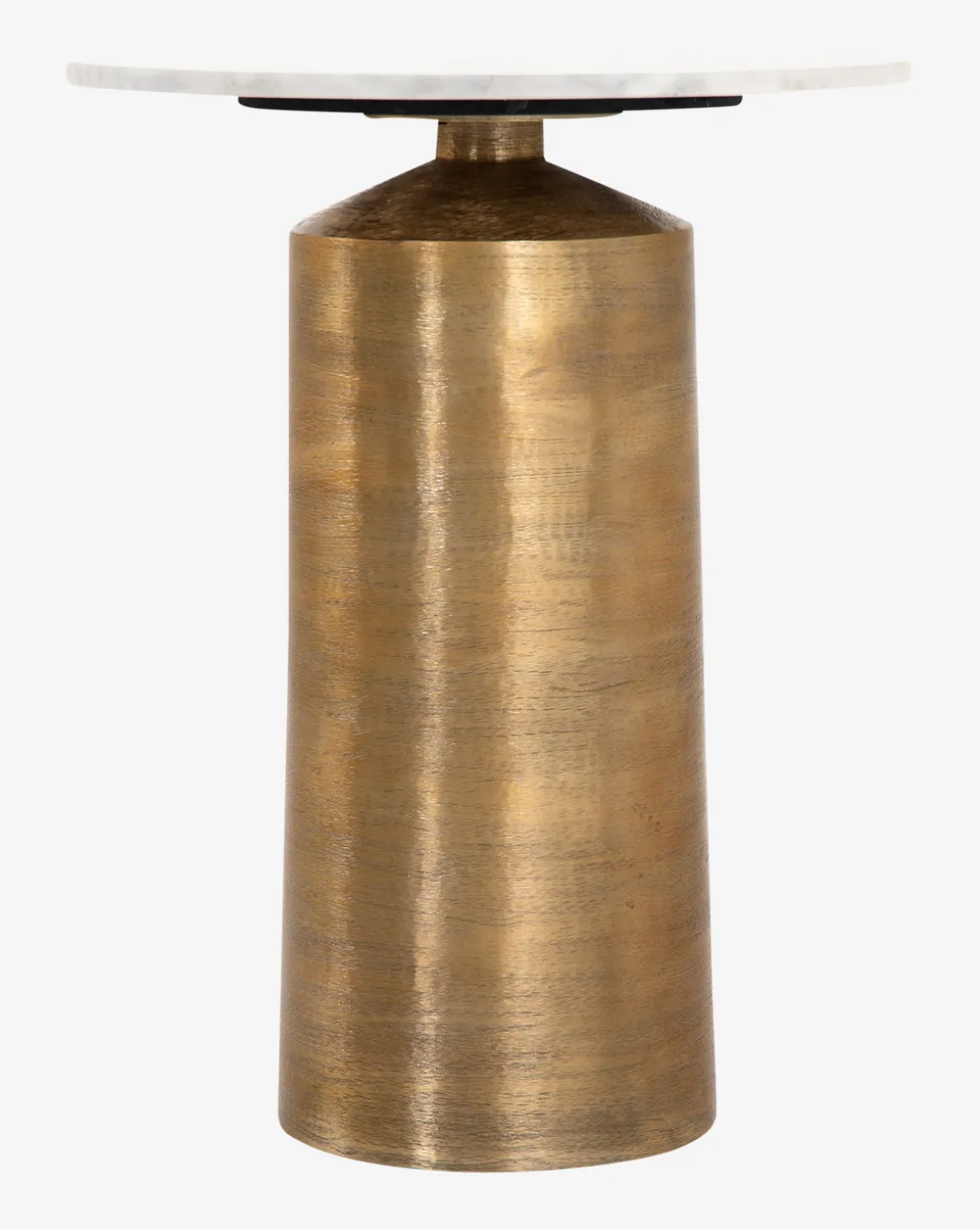 Crafted from a shapely aluminum base and marble top, this dramatically scaled pedestal table is filled with sculptural intrigue. Styled beside your bed in pairs, or holding a light fixture in your living room, the Pia Side Table makes the most of its modern form.