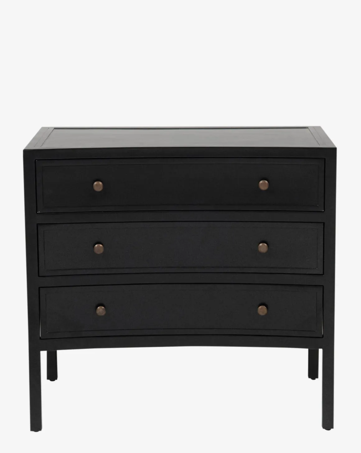 This dresser is an updated take on French campaign furniture; originally designed to make the military march feel as much like home life as possible. Its bowed front, matte black finish, and contrasting brass pulls give it a unique industrial feel that is easy to match with other pieces.