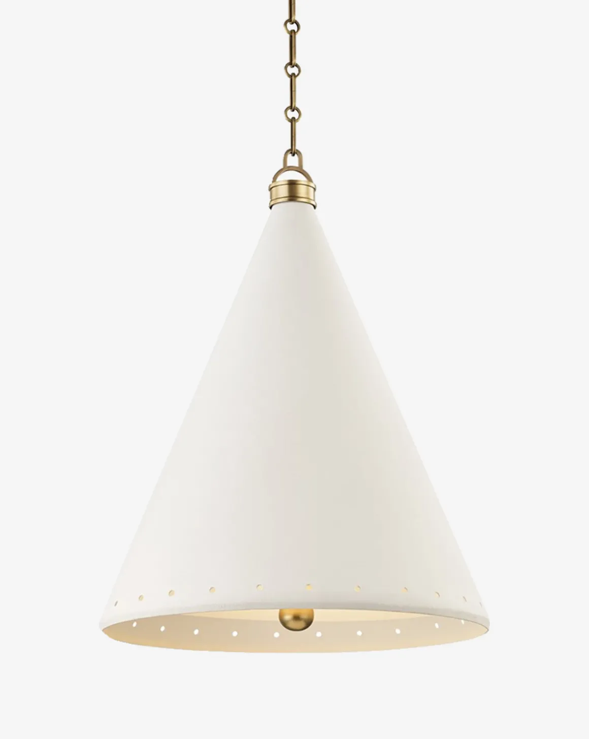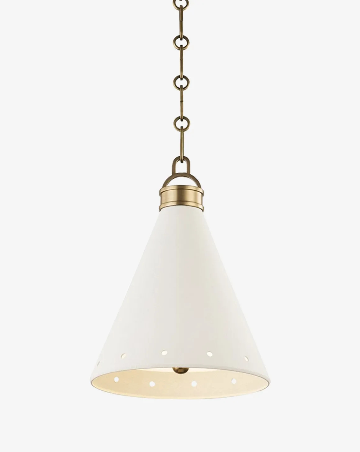 Classic and modern at the same time, this cone-shaped pendant is sure to become a fast favorite styled over your kitchen island. Circle cutouts line the rim of its steel shade to add a touch of dimension to the simple form, while aged brass details complete the design with an elegant touch.