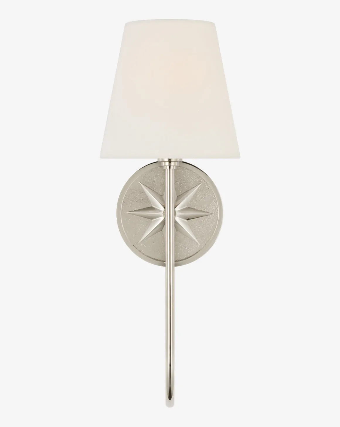 In your choice of finish, the Polaris Sconce is simple yet elevated. Its swooped arm brings an inviting feel to your space and complements the tapered white linen shade.