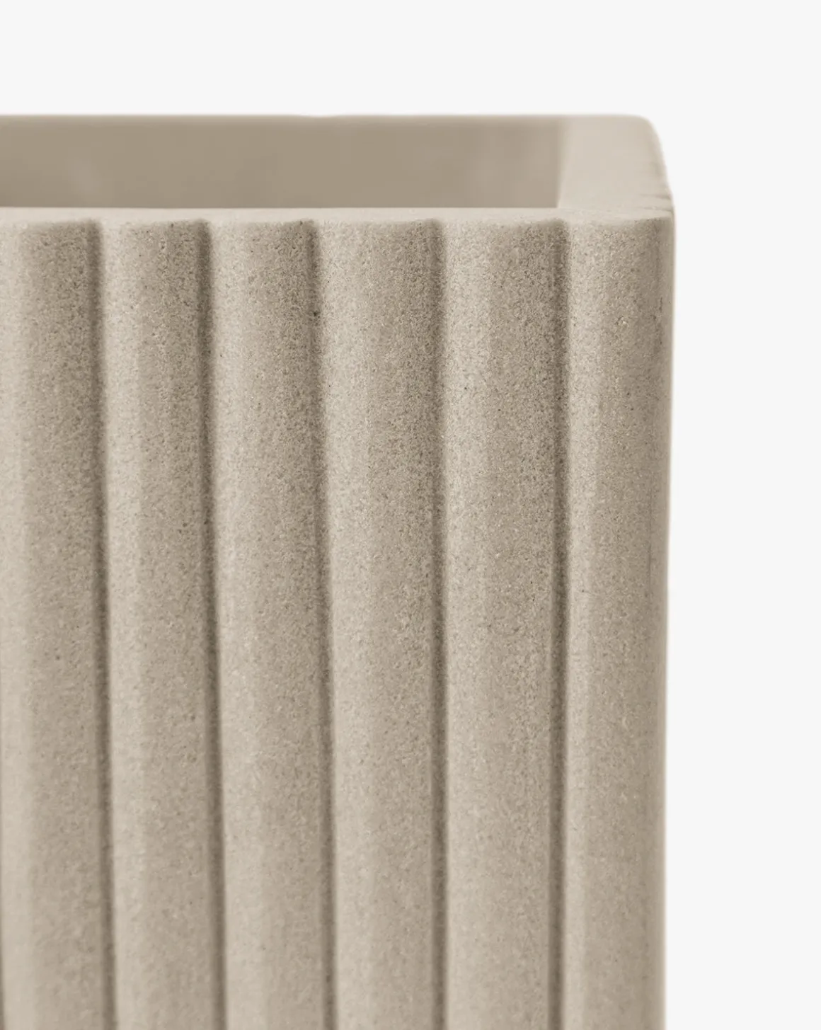Playful yet weighty, the Prentiss Waste Bin is made from off-white mint sandstone. The ribbed sides and squared shape bring dimension and practical use to your bathroom styling.
