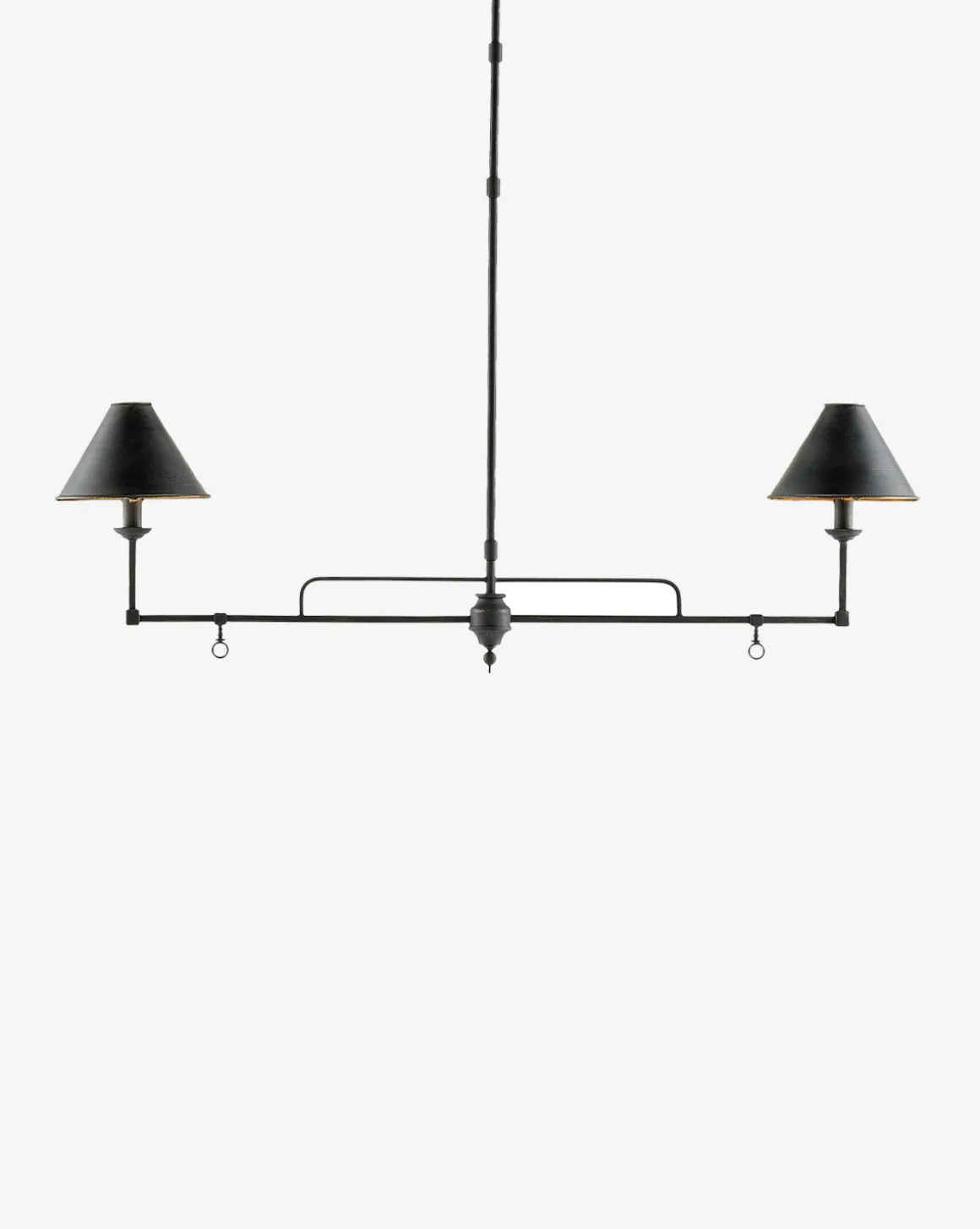 A traditional oil lamp design gets a modern update with sleek, rectangular framing in the Prosperity Rectangular Chandelier. Its shades are lined in gold leaf, bringing opulence to its illumination, and is finished by hand to give unique variance to every chandelier. Finished in French black in a brushed technique, this fixture has a rustic feel that lends a warm, lived-in quality to your space.