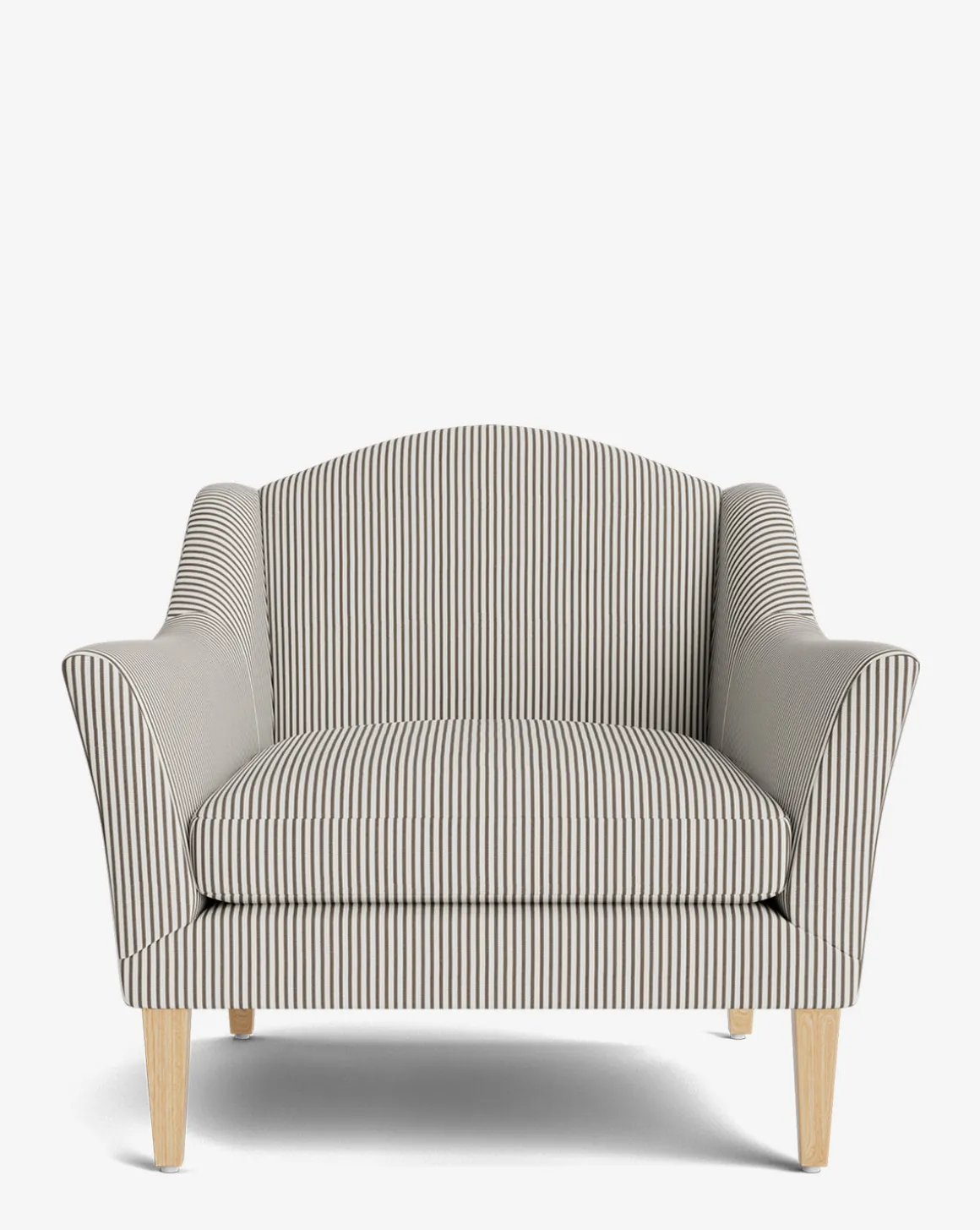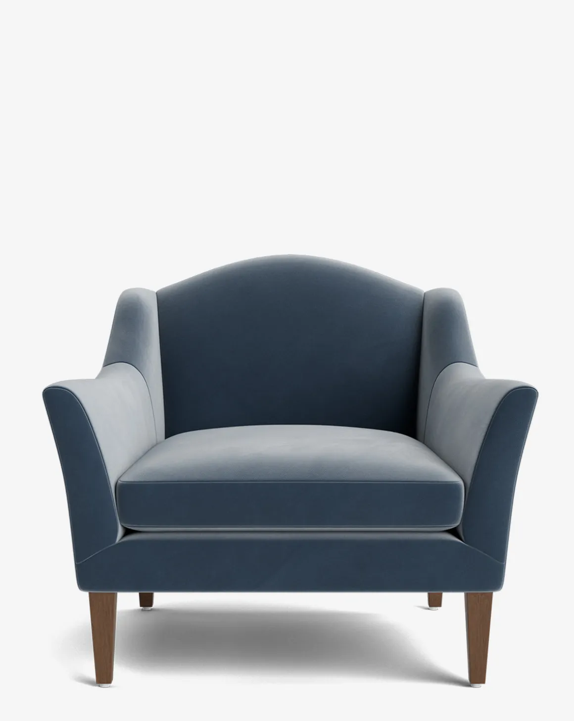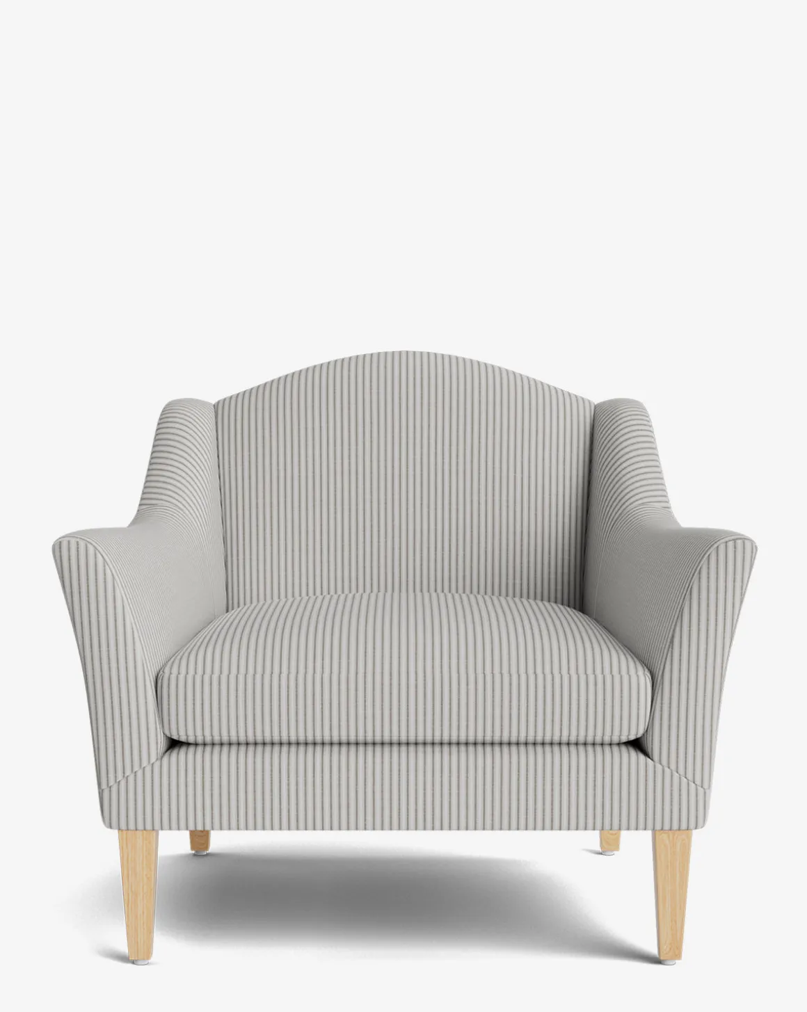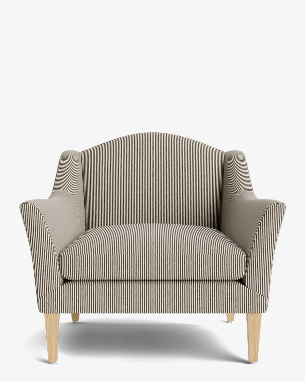 Made to order with a classic silhouette, the Prudence Chair has tapered oak legs that hold its frame with elegantly curved arms and a rounded top. Designed to complement and elevate your home, the chair is available in a selection of high-quality fabrics that highlight its timeless structure.