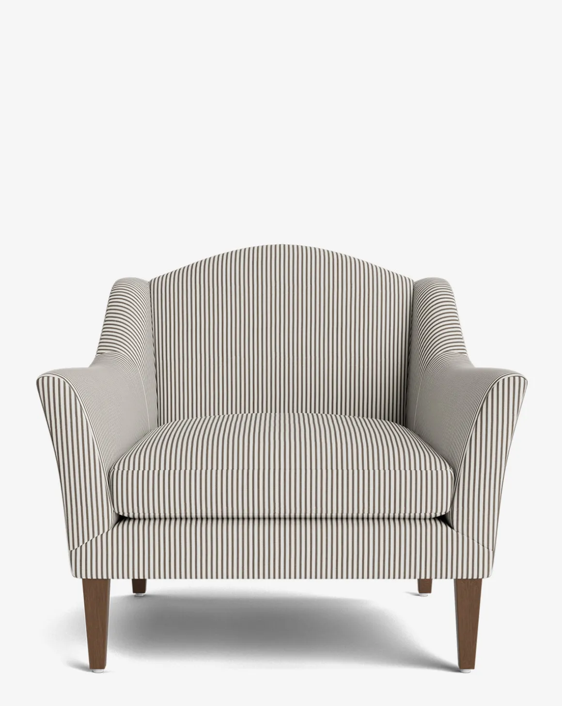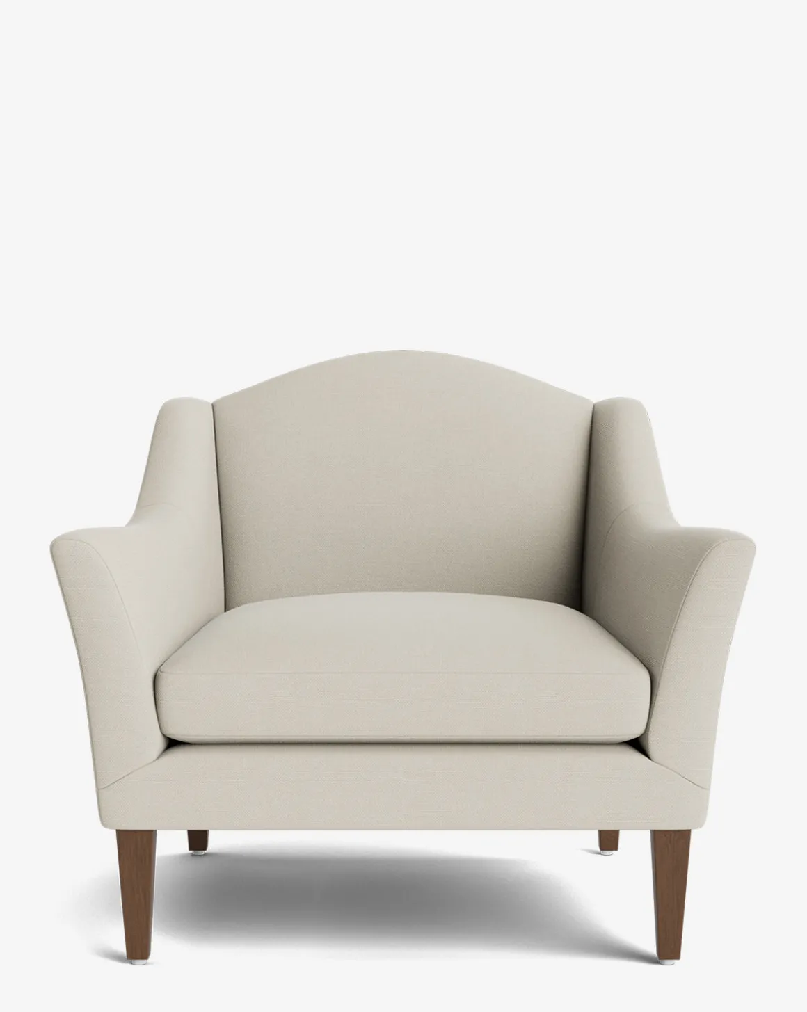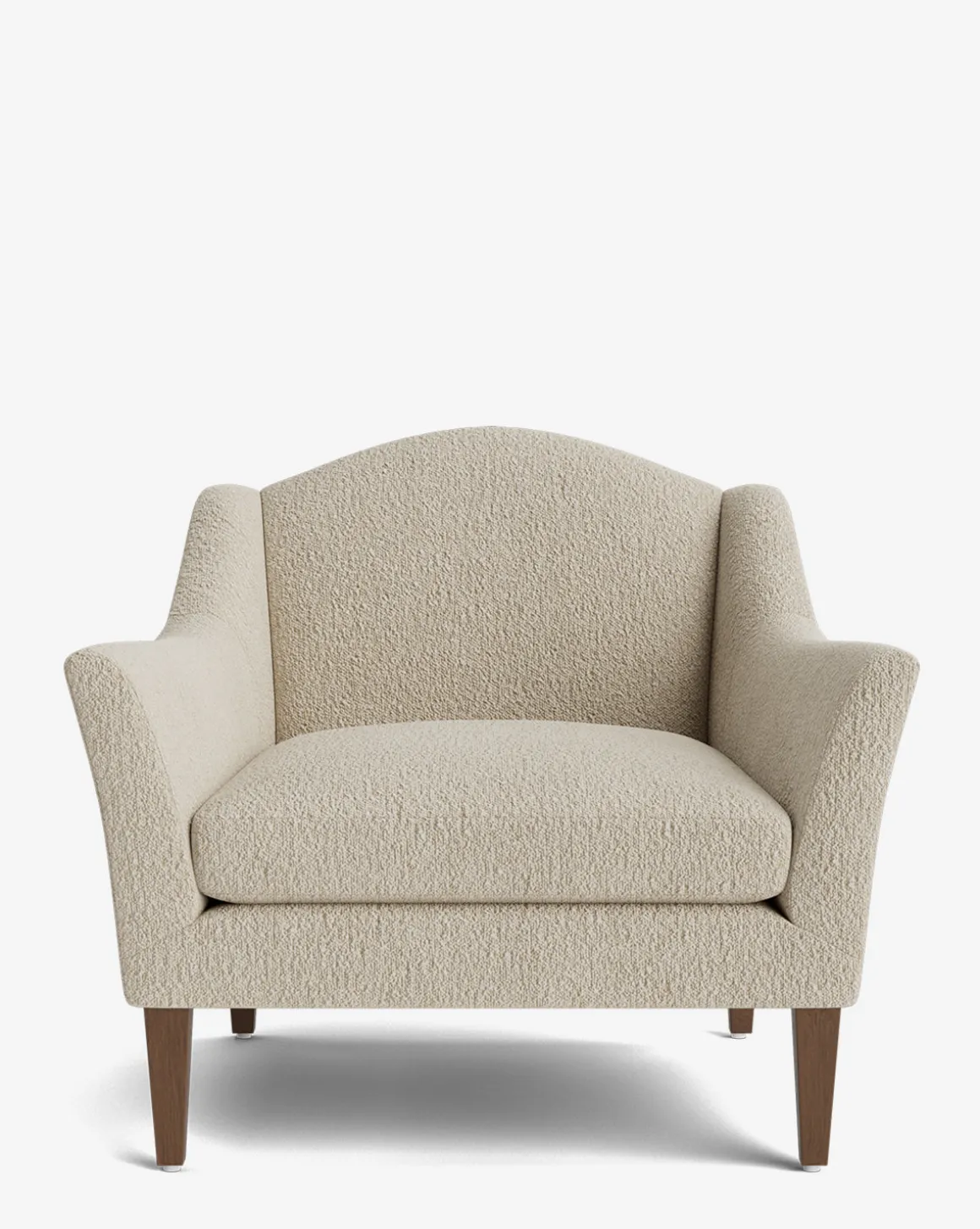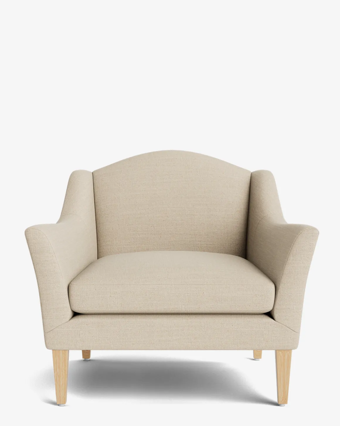 Made to order with a classic silhouette, the Prudence Chair has tapered oak legs that hold its frame with elegantly curved arms and a rounded top. Designed to complement and elevate your home, the chair is available in a selection of high-quality fabrics that highlight its timeless structure.