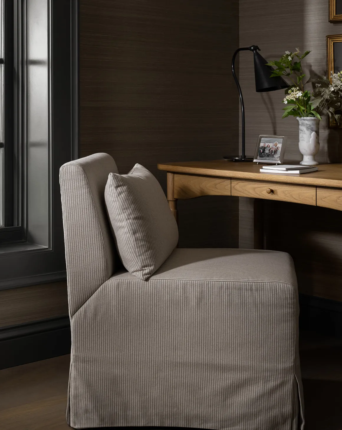 In an inviting and full design, the Scaletta Desk Chair is both casual and elevated. Upholstered in a natural and ivory striped linen, the ticking stripe desk chair lends comfort and dimension to your styling.