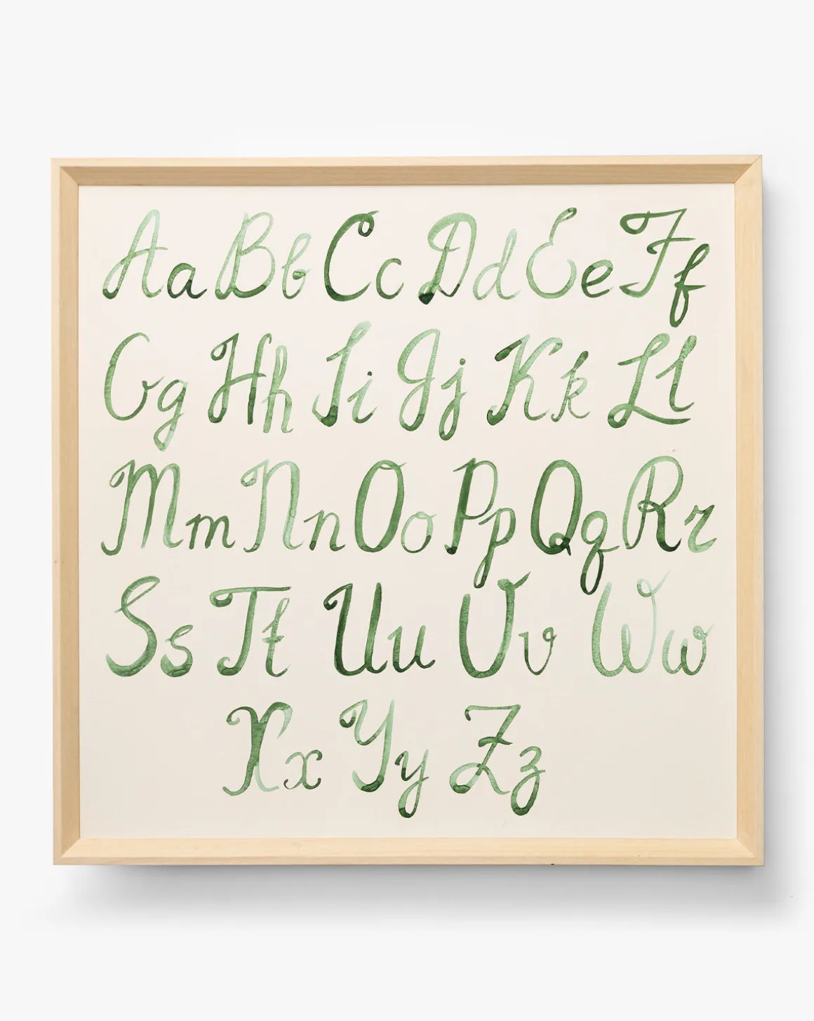 Simple yet charming, Script Alphabet features an elegant handwriting style that feels both classic and full of character. The white background and picked white-finished frame lend to versatility, while the green script adds a subtle and soothing element of color. A timeless addition to a nursery, playroom, or reading nook, this piece is perfect for inspiring learning and nurturing curiosity.