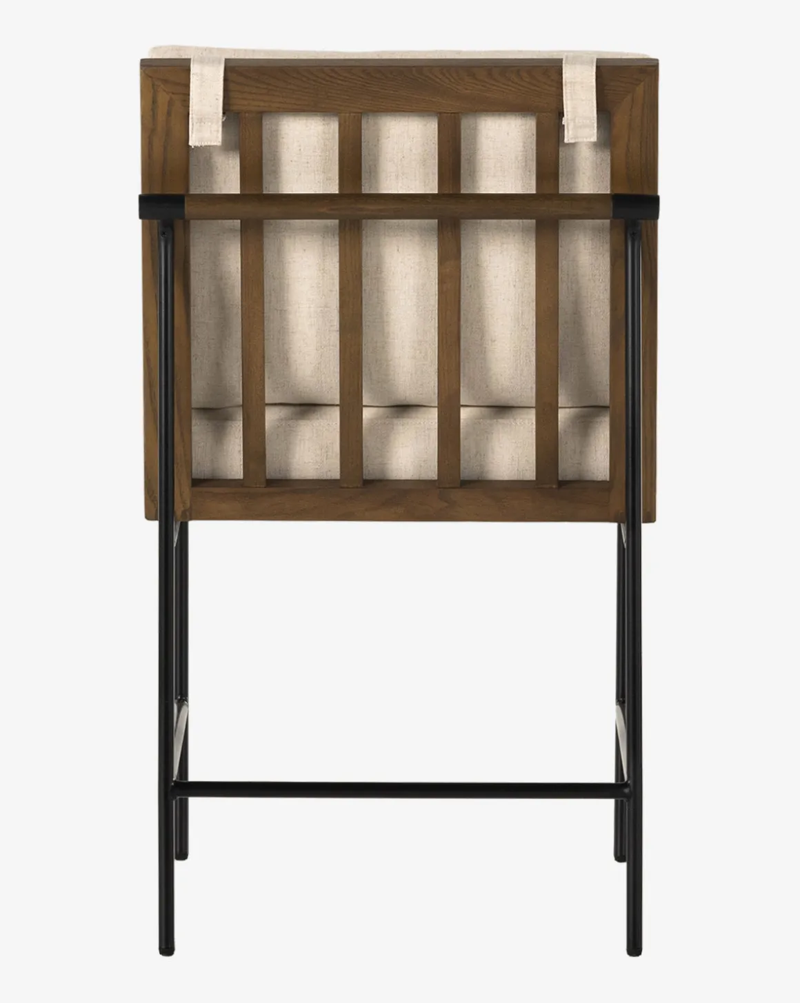 Clean and straightforward, the Selas Dining Chair has a slender frame of black-finished iron and a floating ladder back of black, solid parawood. This frame holds cushions upholstered in high-performance fabric, with rear fabric handles that bring a thoughtful finishing touch to the piece.