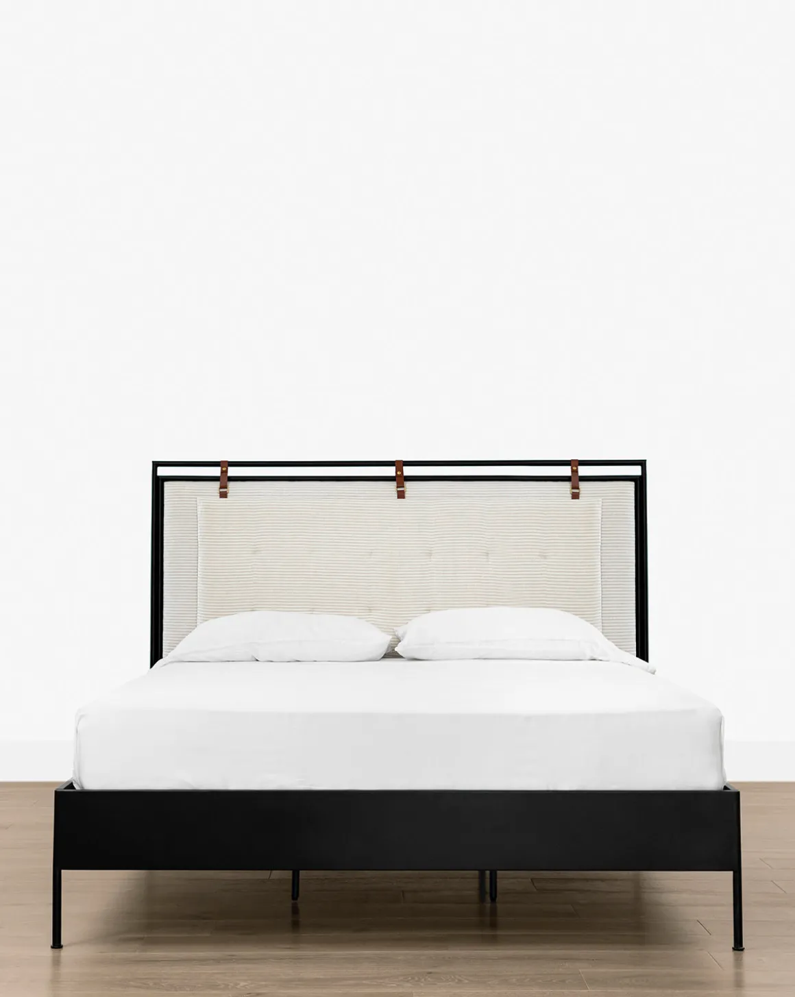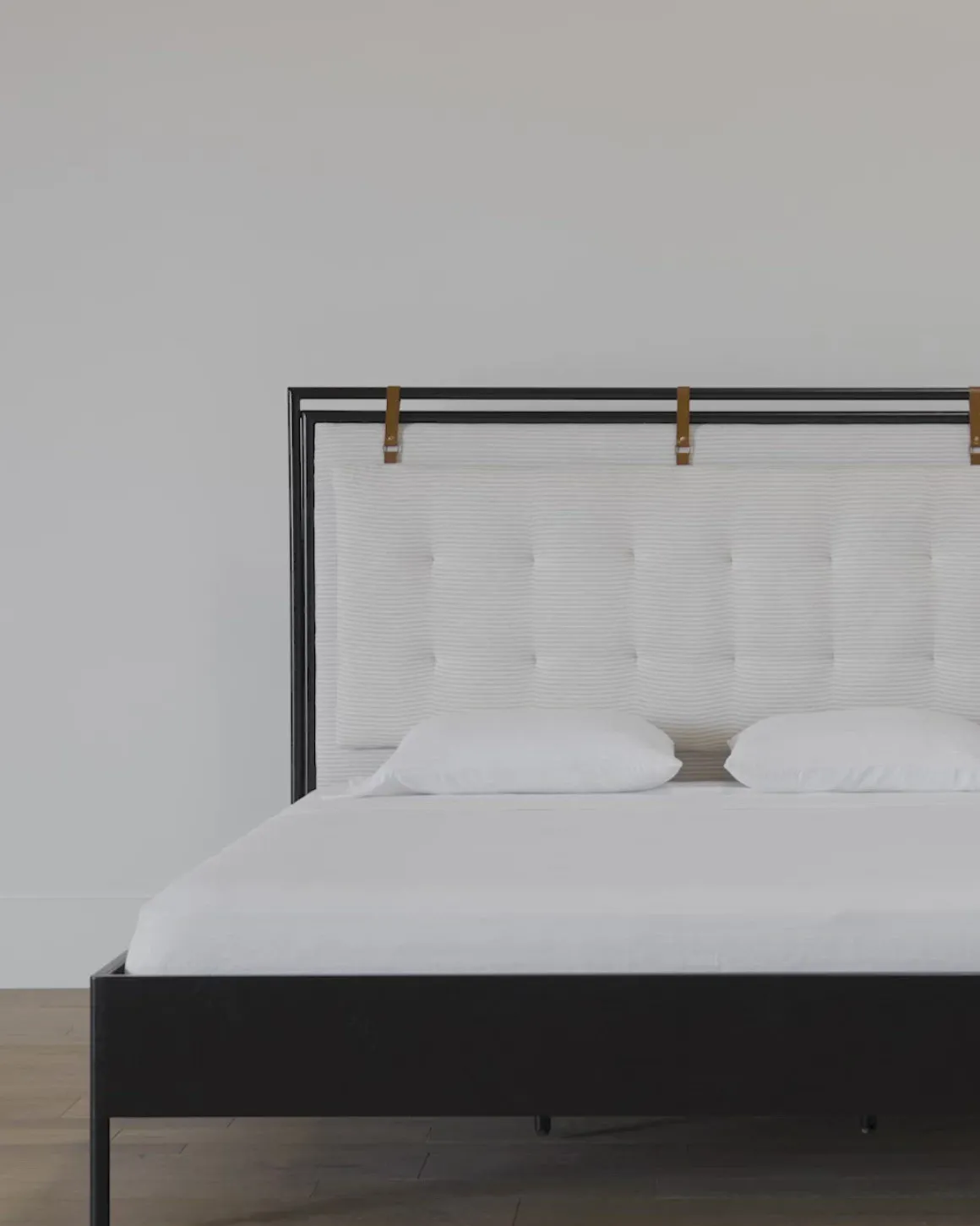The Sutherland Bed brings an industrial yet cozy style to the bedroom. A padded, raised gray headboard gives dimension to the piece, with leather details that warm the palette. Held in a nuanced, black-metal frame that gives layers to this stunning bed, the Sutherland Bed brings design detail and warmth to elevate the style of any bedroom space.