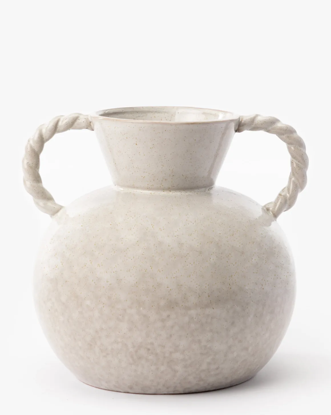 The Tyrion Vase has a vintage-inspired, rustic feel that highlights its craftsmanship and materials. Made from ceramic with a neutral reactive glaze, its charming handles and classic shape bring depth and dimension to your decorative vignettes.