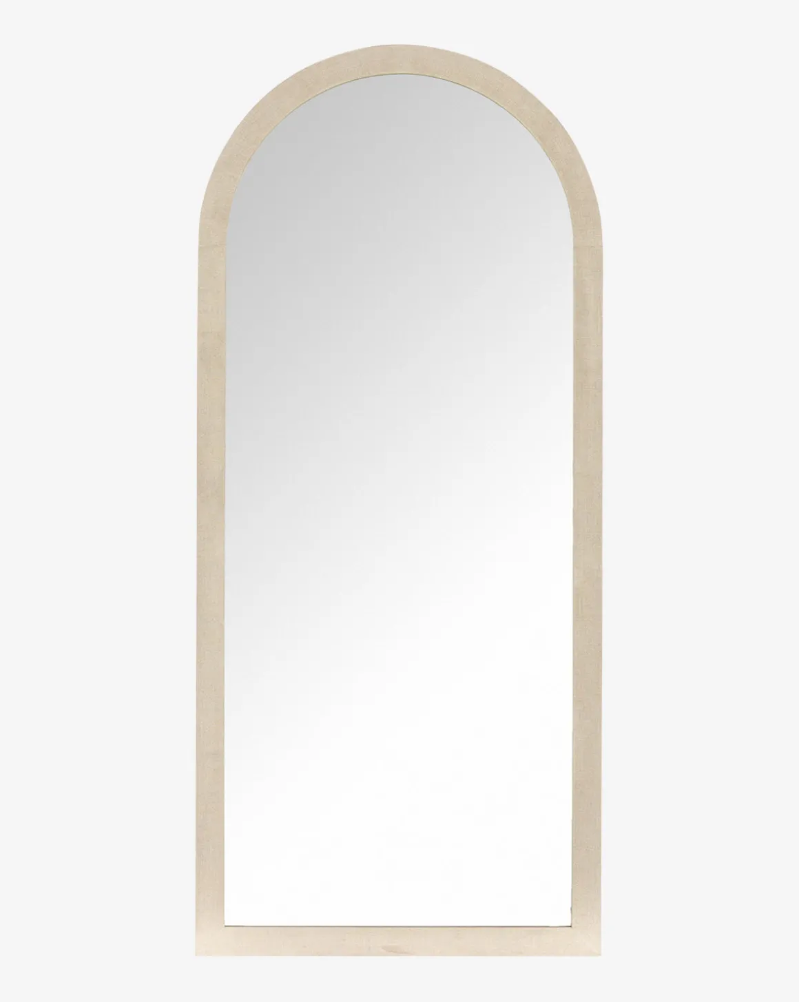 Simple yet elegant, the Vallie Arched Floor Mirror offers texture to your space with its ivory painted linen-wrapped frame. Its soft arched design brings a delicate quality to its large stature, and seamlessly suits bedrooms or common living spaces.