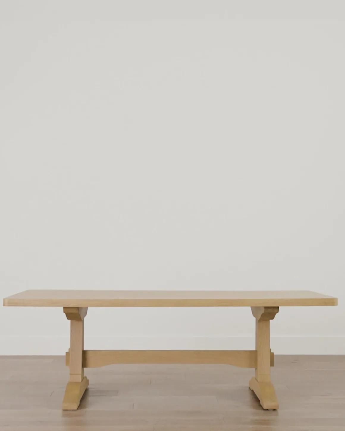 Crafted from oak with a heritage white oak finish, the Wilton Dining Table brings both form and function to your dining space. With its architectural inspiration and timber framing details, its high-quality construction stands the test of time.